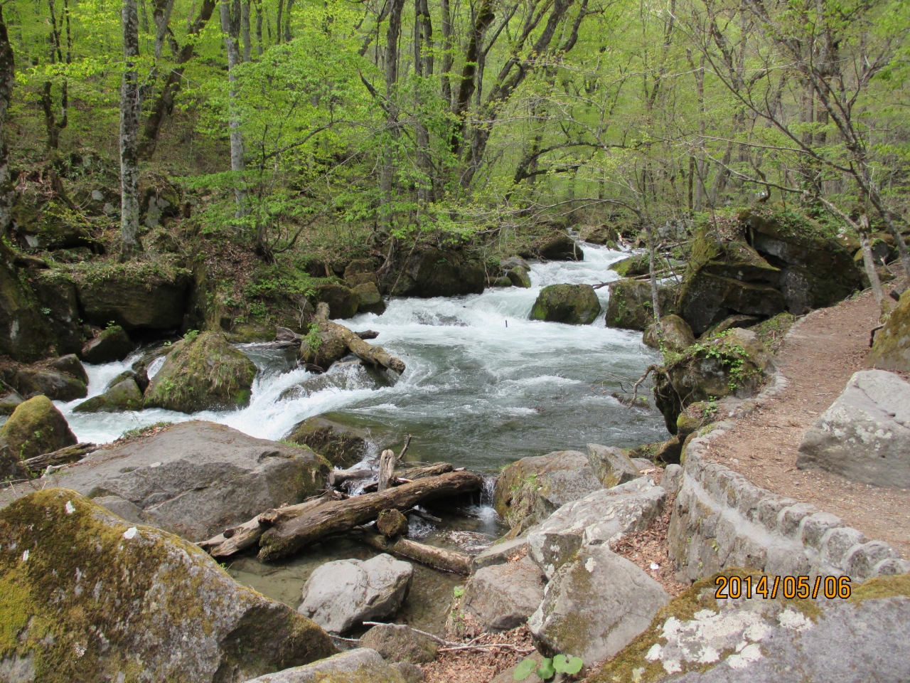 奥入瀬渓流の中のいろいろある観光スポットの中でも、阿修羅の流れは代表的な観光スポットです。新緑の中のゴツゴツした岩の中を流れる激しく流れる水の渓流はお見事しかいいようがありません。自分だけのベストアングルを見つけての記念写真は絶対に撮りましょう。