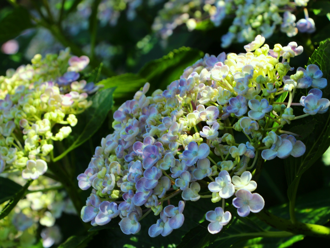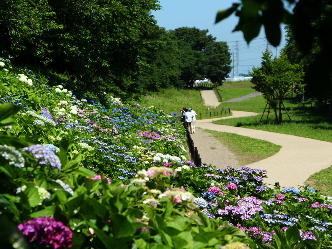 川沿いの土手の紫陽花は日当たりが良く、かなりの紫陽花が満開状態ですが、駐車場側の日陰の部分はまだ蕾の花や、花弁の色が白に近いものも多く、花弁に色が入るのは6/22の週末に向けてと思われます。