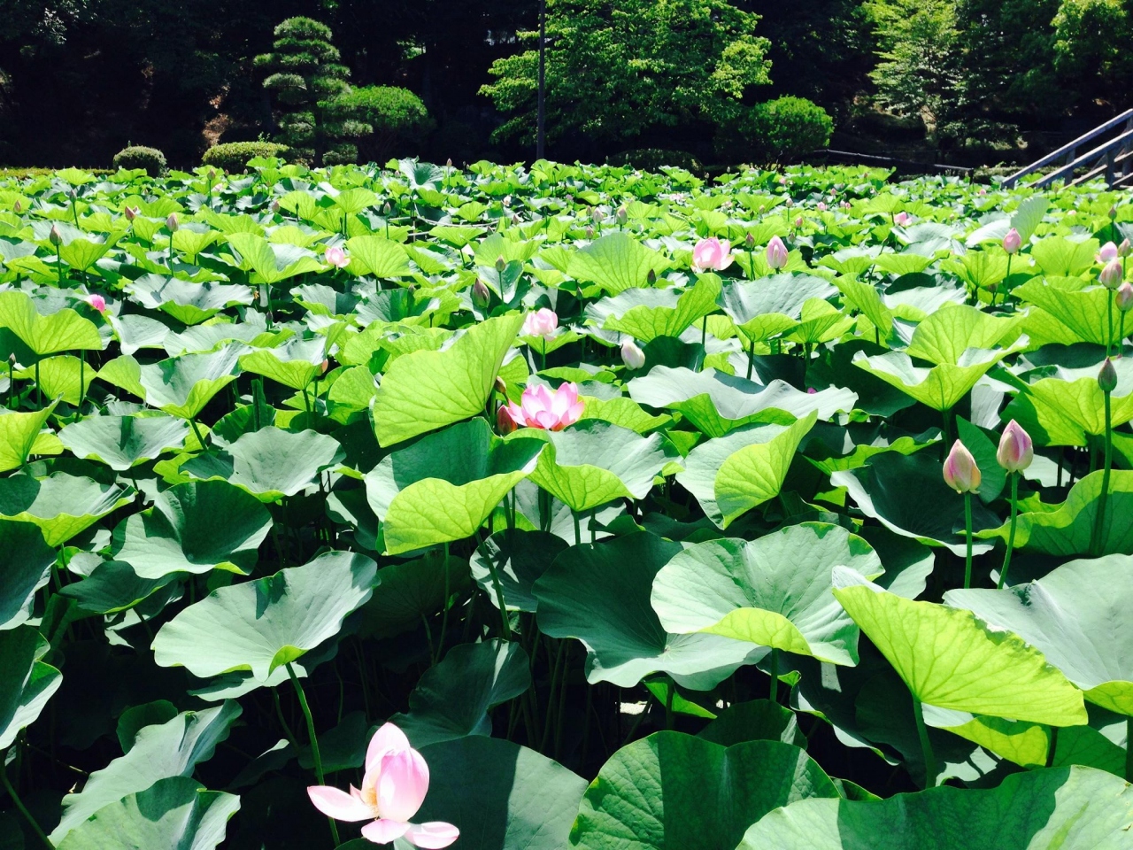 桜がたくさん植えられており、3月末は花見客で賑わう公園ですが、今は大きな池にピンク色が鮮やかな蓮の花が満開で、ゆったりと真近で鑑賞することができます。