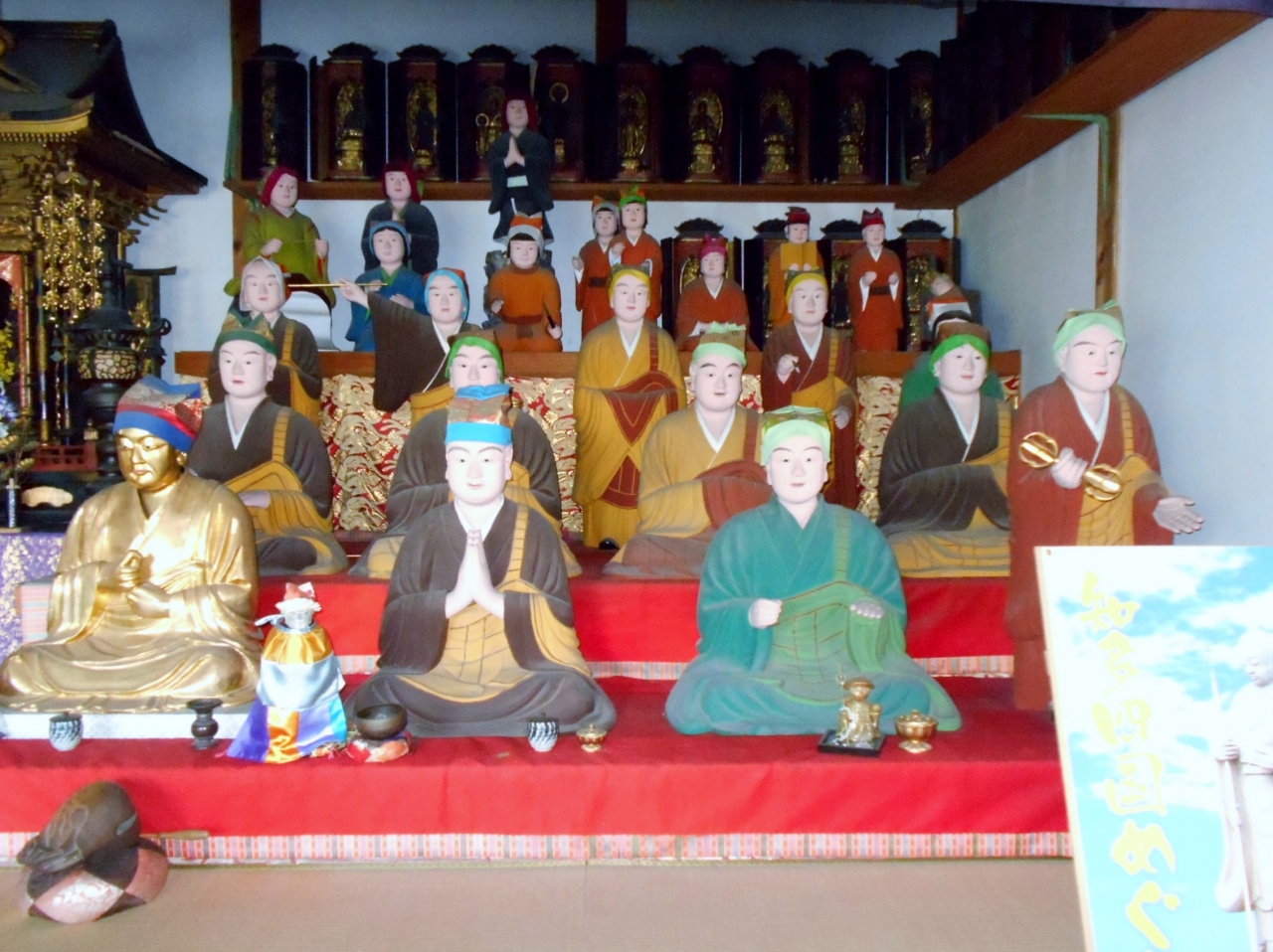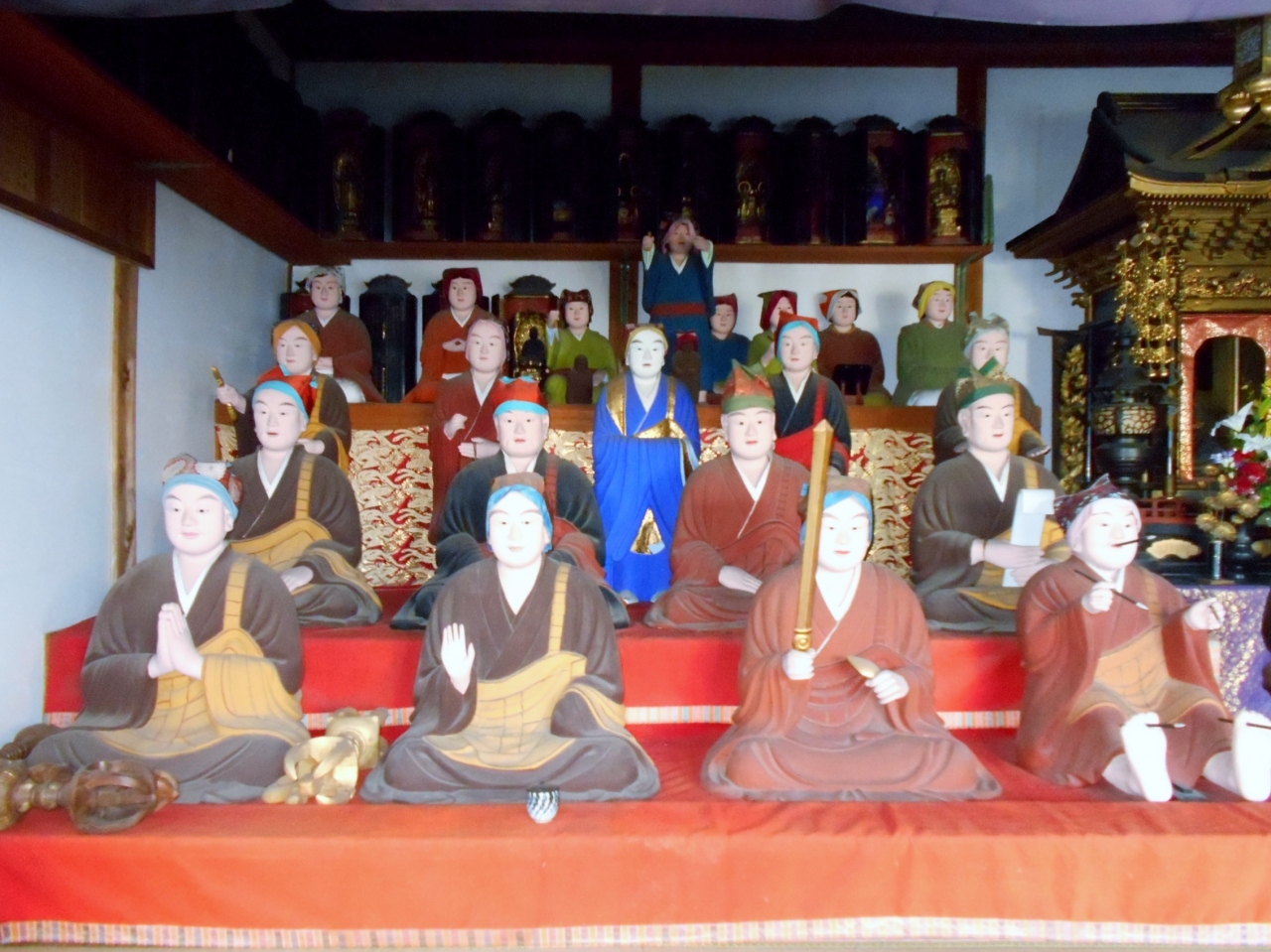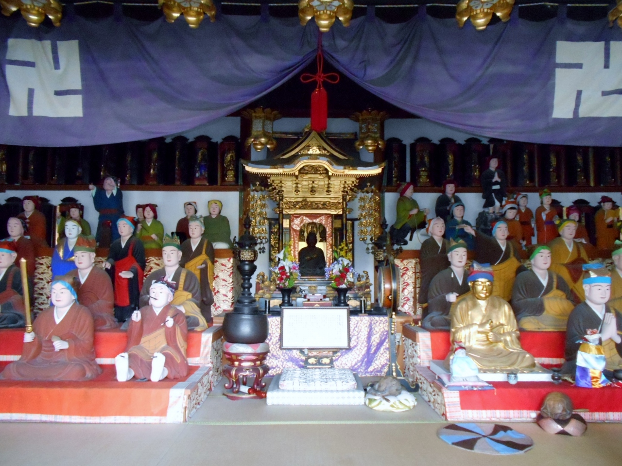 東光寺の最大の見どころ(=拝みどころ)は弘法堂内部の「歳弘法」。堂内に弘法大師さまが産まれてから入定するまでの62年間の生涯をあらわしているそうです。元々はちゃんと62体ありましたが、昭和20年の三河地震で弘法堂が倒壊した際に17体が犠牲になり、現在は45体です。