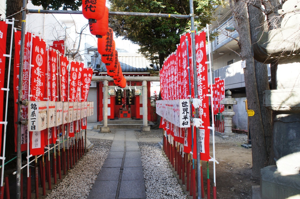 錦糸町駅の近くに真っ赤な幟と提灯が妙に印象的な小さな神社がありました。津軽稲荷神社と書いてありました。なんでこんな場所に津軽?と思いましたが、一帯は弘前藩津軽家の下屋敷があったところ。明治後半、敷地が払い下げられた際、神社は地元のものになったようです。東京って大名屋敷にあった神社がそのまま地域の鎮守になったケースってホント多いです。