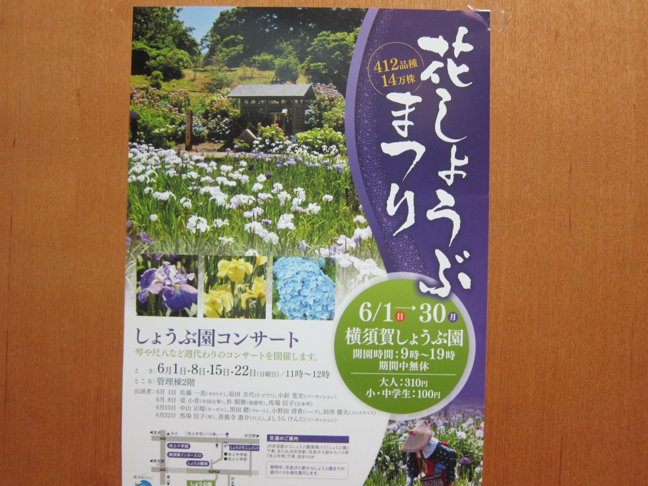 しょうぶ園は、普段は入場無料ですが、4~6月は¥310円です。そのような中、「衣笠しょうぶ祭」が重なる1日だけは入園無料となります(2014年は6月7日(土))。ミニコンサートと違って、太鼓など様々なパフォーマンスが行われるようです(カラオケ発表会は遠慮しておきますが…)。ただ、花菖蒲の開花状況や天気はこの日にドンピシャとは行かないと思います。