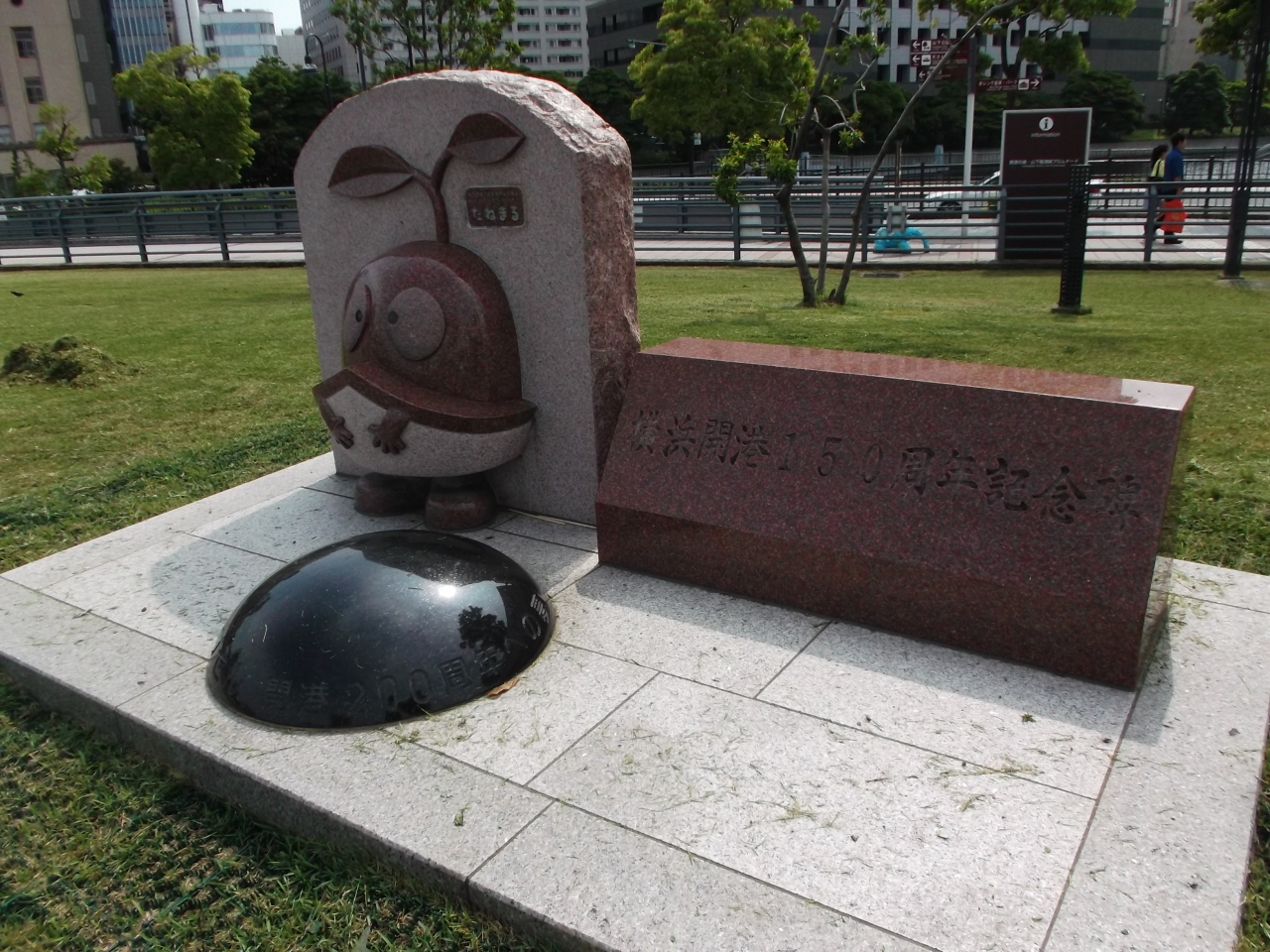 変わったネーミングです。開港博Y150のマスコットキャラクターを施した記念碑のこととあります。ところは象の鼻パーク、山下臨港線プロムナードの赤レンガ側方向の芝生広場の中、海側に向いているため、プロムナードから見ると背後になりわかりません。