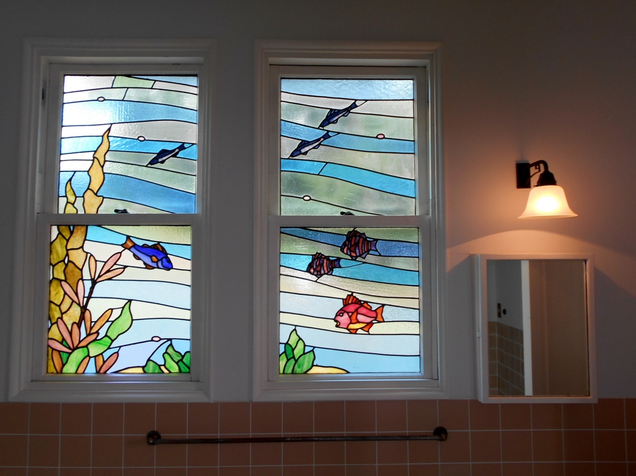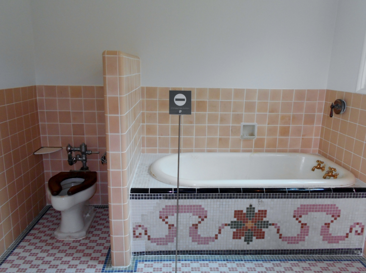 家族がくいついたのはステンドグラスやモザイクタイルの施された浴室。とても昭和初期とは思えないような空間でした。