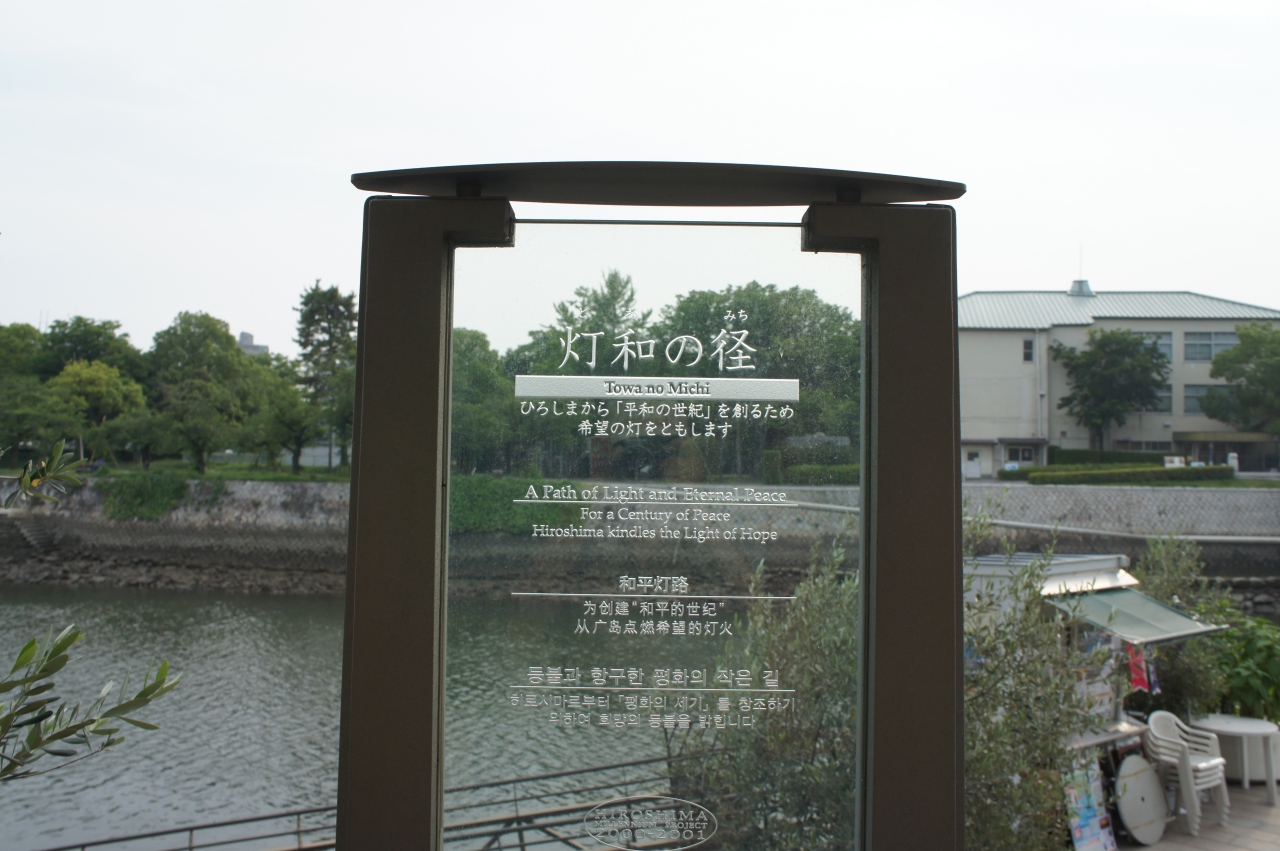 灯和の径は、「とわのみち」。広島市のミレニアム事業として、整備されたもので、元安川左岸緑地帯から平和大通り緑地帯にかけて、ガス灯やメッセージ灯、ローポール灯などが設置されています。ただ、夜にならないと、その景色は見れません。