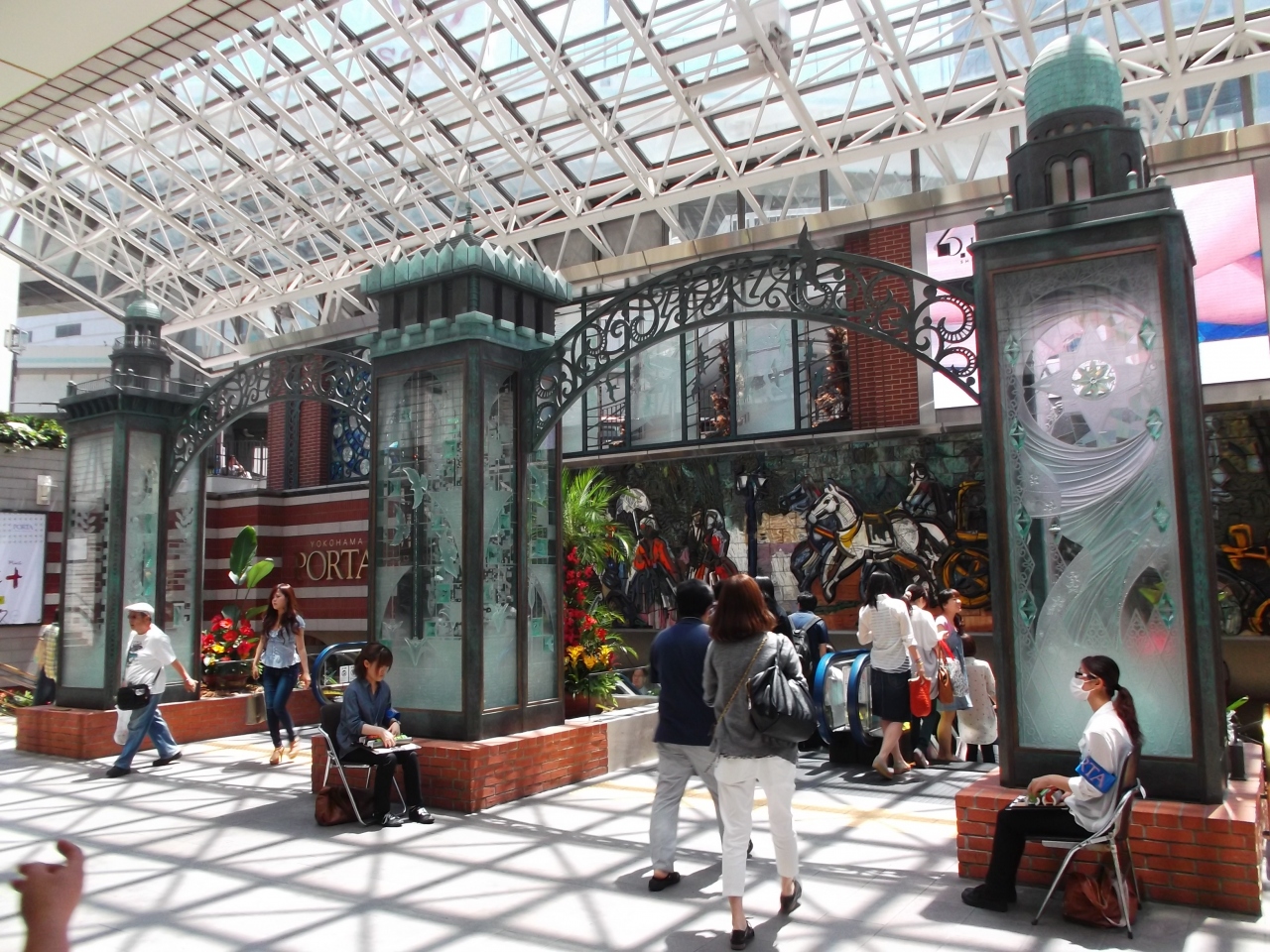 ここ横浜駅東口、地下街ポルタへの階段エスカレーターのところ・エントランス、ガラスの衝立風の3つのオブジェに気がつきますでしょうか。これが、地下街ポルタのウエルカムアートゲートです。観光スポット名は「ポルタ三塔物語」。ガラスの中にはLEDライトで照明の演出がされています。三塔とは横浜観光ガイドに必ず載る「県庁・キング」「税関・クイーン」「開港記念館ジャック」の塔をモチーフにしています。なるほど!と見てみましょう。