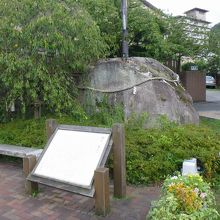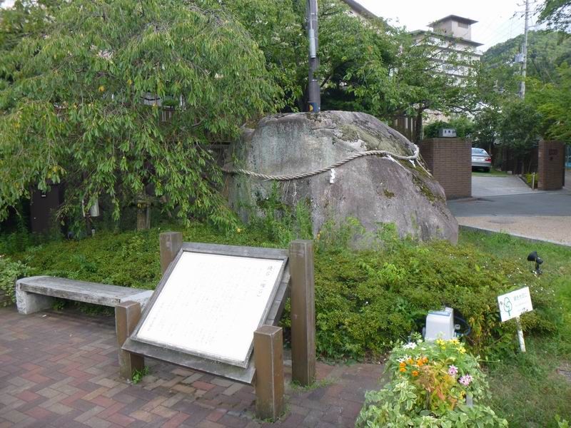 神戸電鉄の有馬温泉駅にほど近い太閤橋。駅から歩いて行くと、太閤橋を渡ってすぐの所にあります。石の前にはいわれが書かれており、「松永城主に向かって、湯泉神社の祭神様が袂から取り出して投げた小石が、年月を経て大きくなった」ということらしいです。橋の向こう側にあるせいか、訪れる人は少ないです。