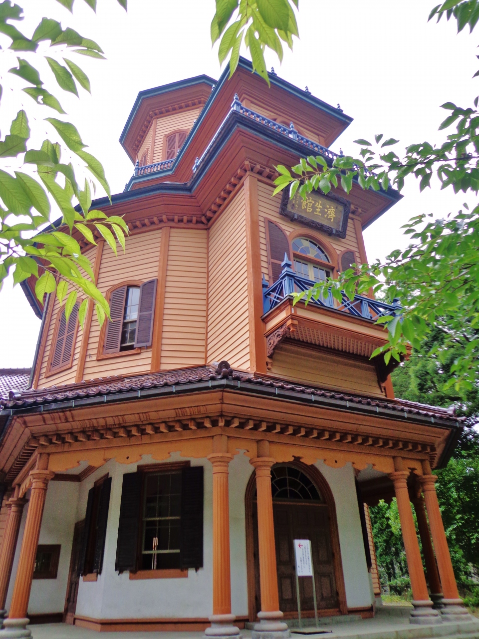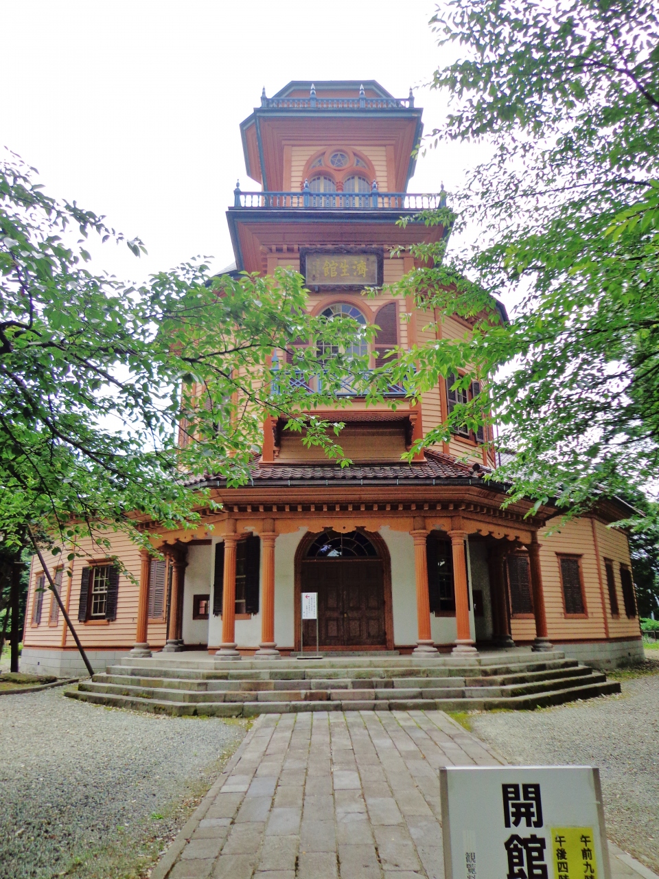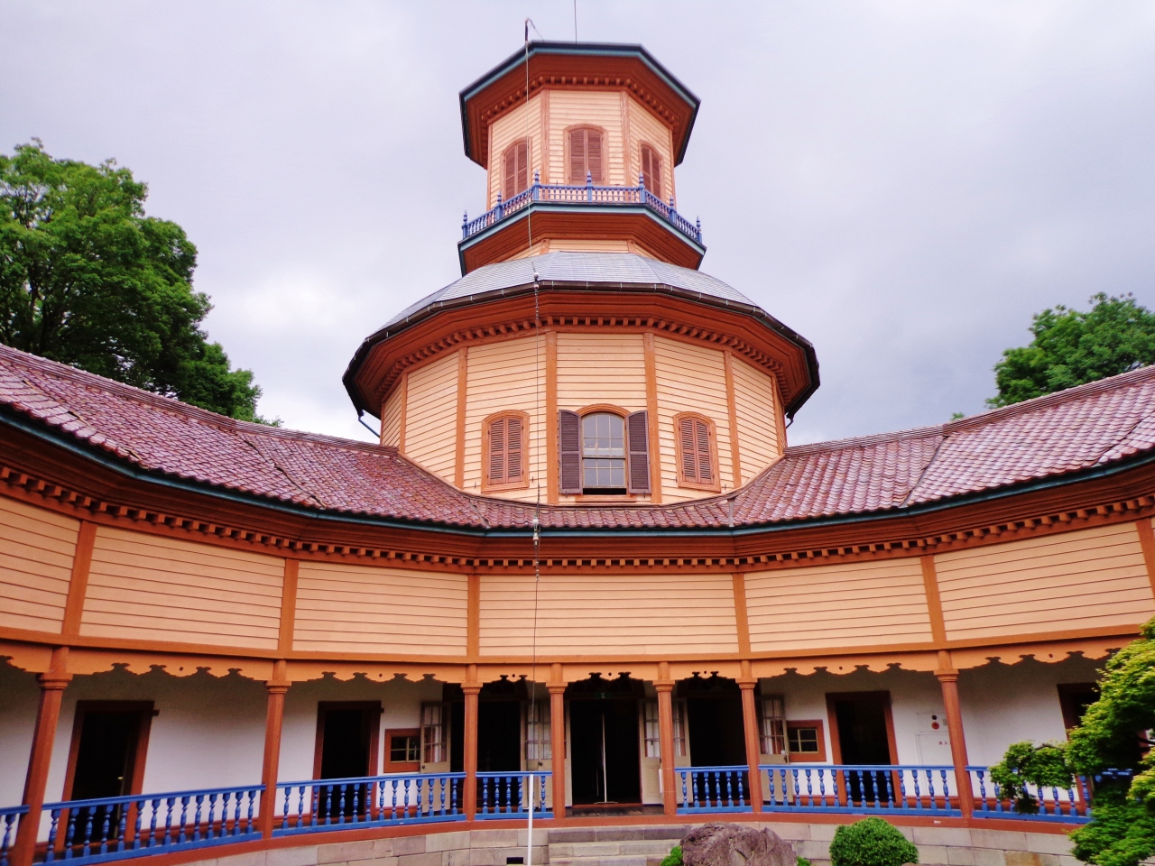 建物の全体の構造は、角面からなる円形の特異な形態で、明治初期における木造下見張りの擬洋風建築の傑作といわれています。その後、昭和41年(1966)に重要文化財に指定され、昭和44年(1969)に霞城公園内に移築、現在、山形市郷土館として文化財保存の活用を図っています。
