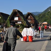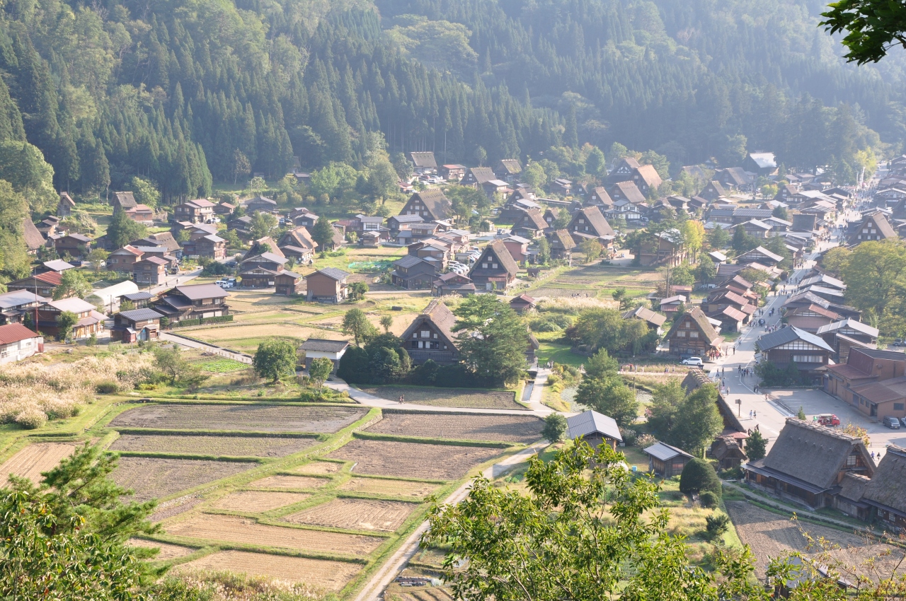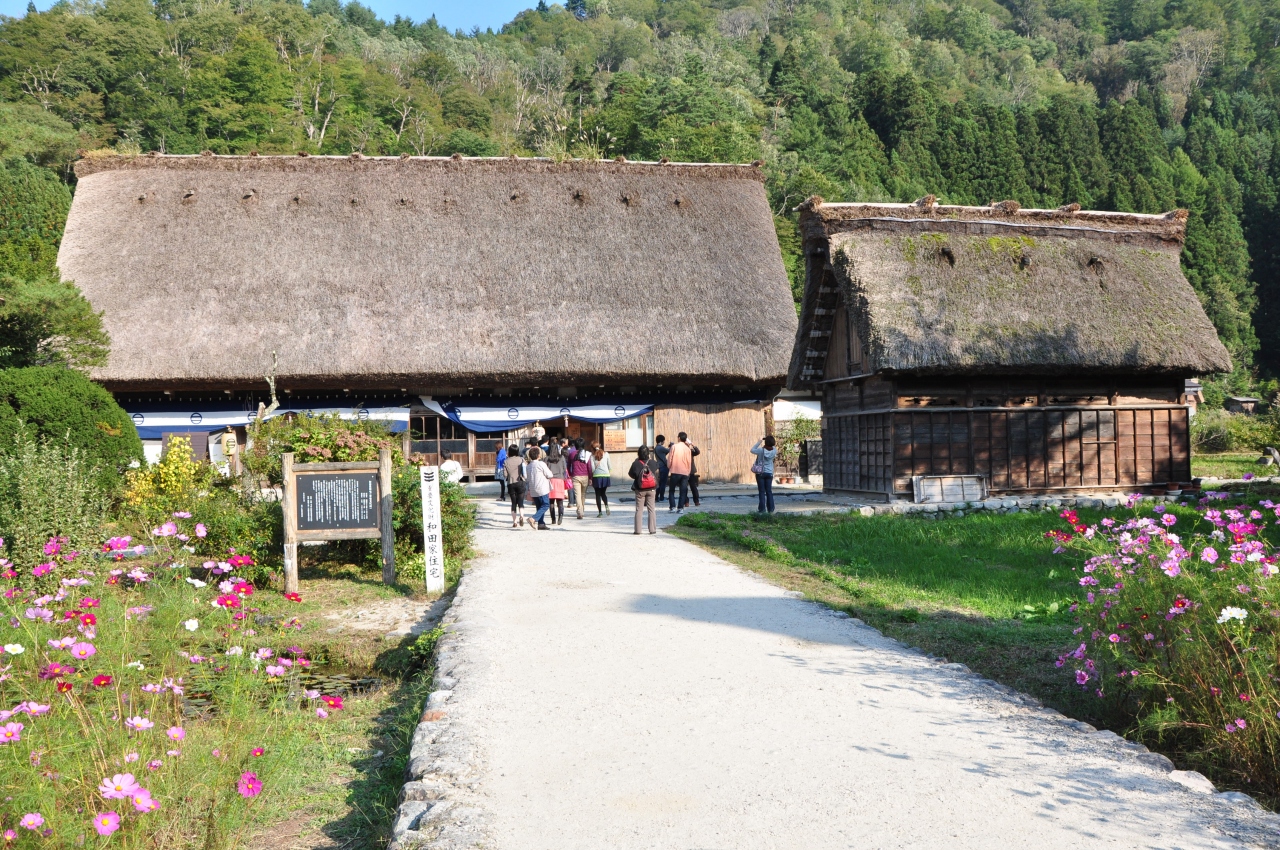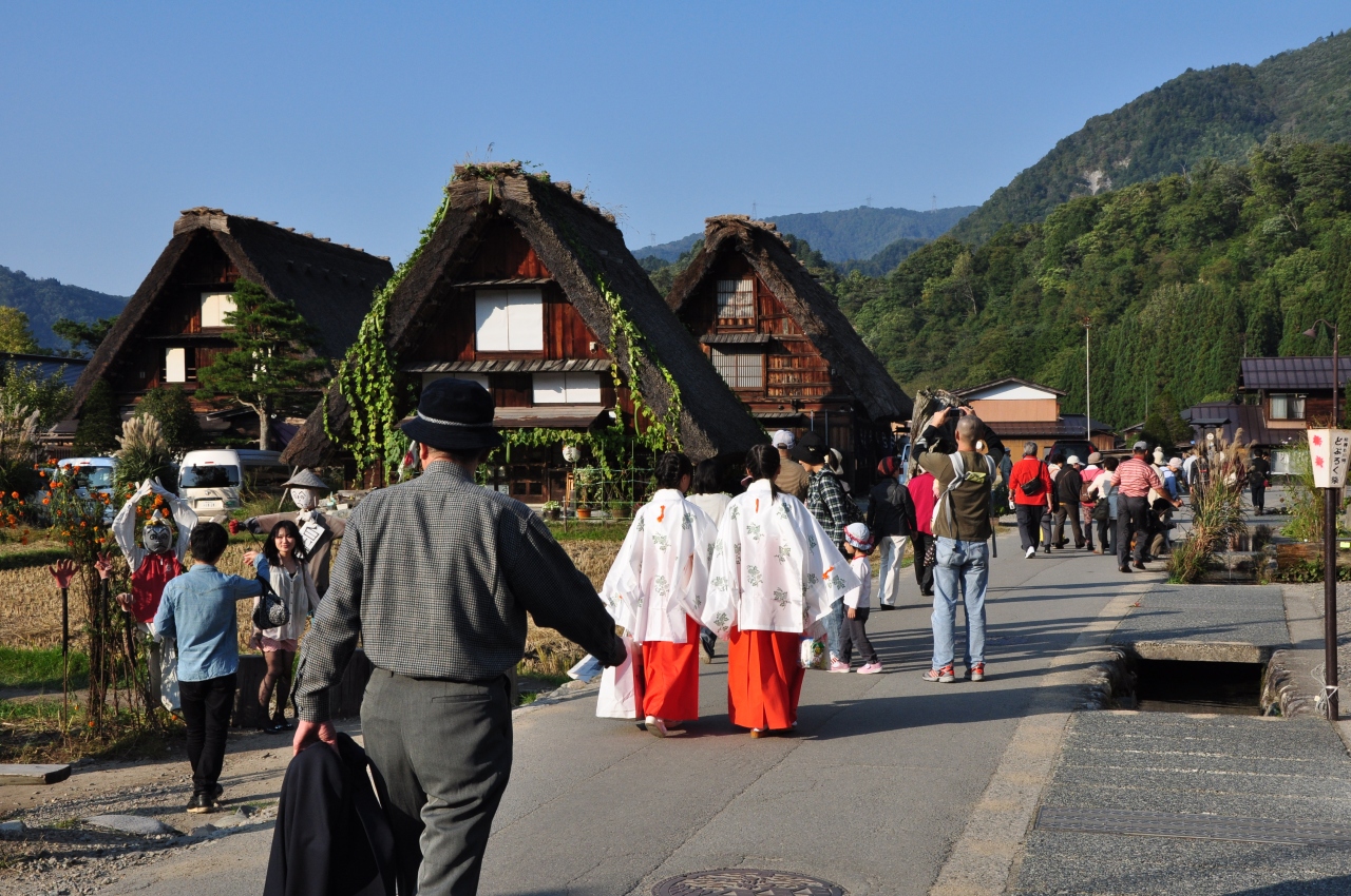 白川郷を訪れた日は,たまたま,どぶろく祭りの日と重なってしまい,渋滞がひどくて,観光バスを橋の手前の鳩谷あたりで降りて,歩いて行きました。そのため,まず,萩町城跡から全体を眺めた後,和田家や明善寺に行って,どぶろく祭りをちょっとだけ見て,駐車場に向かいました。