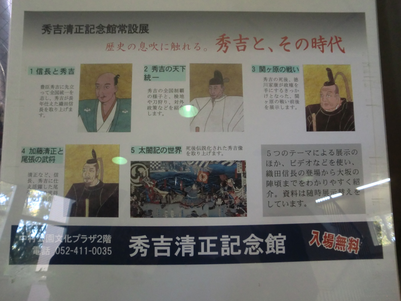 中村公園内にあり、中村図書館の2階。無料の記念館で秀吉と加藤清正という中村区の英傑を展示。1時間ほどで見れる。映像、音声の展示もあり。じっくり見れば、両者の知識が深まる。周りには、両者にゆかりのあるお寺などもあるので散策可能。