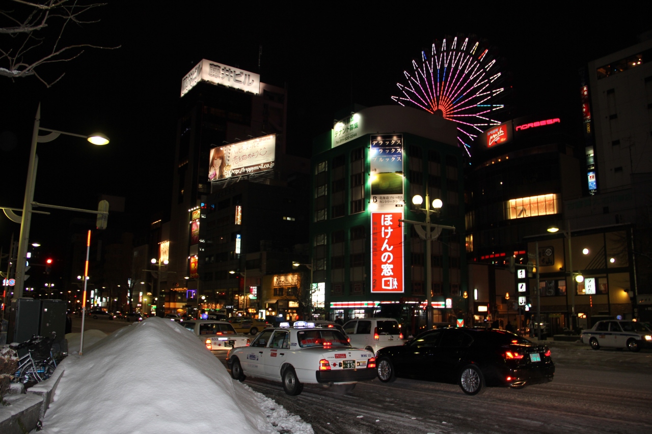 観覧車は夜になるとライトアップをする。すすきのを歩いていれば大体この大きな観覧車を目にすることができる。