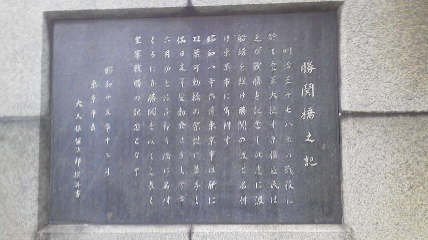 隅田川に関わるかつては開閉式の橋だったのでがここ”勝鬨橋”で築地と月島というか晴海の間に関わる橋として現在でも活躍しています。約40年前には、開閉しなくなりましたが、今でも面影があります。この「勝鬨橋記念碑」は月側の築地市場の脇というか隅田川のそばにありますので。築地散策の際に訪れてみたらいかがでしょうか。