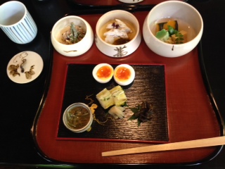 最初にひょうたん型の入れ物に入ったおかずと、黒いお盆のおかず、汁物が出てきます。
