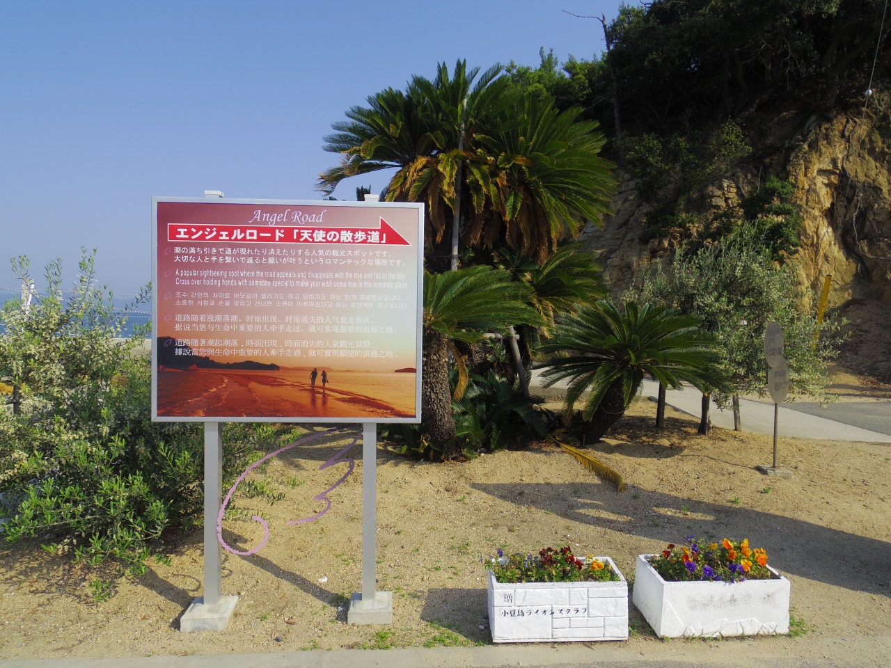 干潮の時間帯は事前に調べておく必要あり。干潮時には砂浜を渡り、左側の岩場も歩けた。岩場には海水が溜まっている場所や苔も生えているので滑らない靴で。右側は通行禁止となっていた。エンジェルロードの入り口の左側に「恋人の聖地 約束の丘展望台」と言う高台になっている場所がある。1~2分で登りきれる。エンジェルロードが一望できるのでここからの眺めがおススメ。