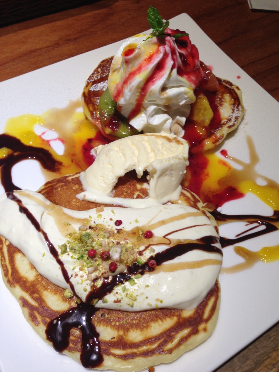楽しみにしていたパンケーキはマスカルポーネソースと、フルーツ盛りの2種類を選択、一枚のプレートに華やかに盛られて出てきた時はテンションアップ。