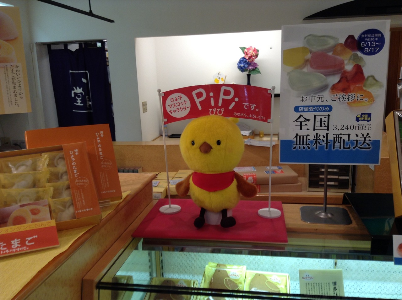 本町商店街の中程にあるひよ子は、飯塚発祥の銘菓ひよこ饅頭のお店です。東京発と勘違いされることが多いですが、ここ飯塚店が発祥です。