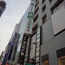 銀座4丁目の交差点から中央通りをワンブロック京橋方面に進んだ角にある書店です。
