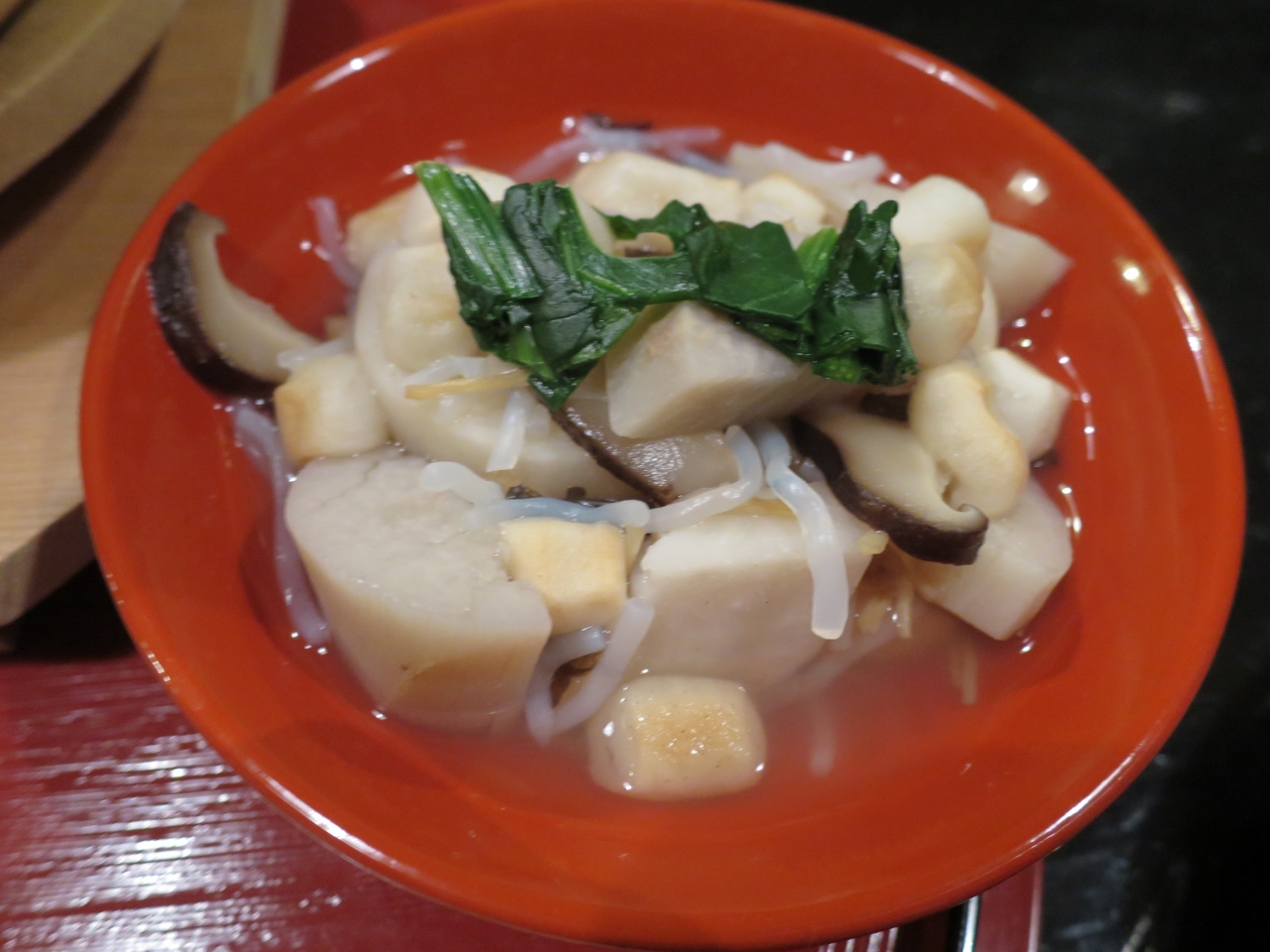 里芋、豆ぶ、干し椎茸、きくらげ、糸こんにゃくなどの具と上品な味付けのおだし。