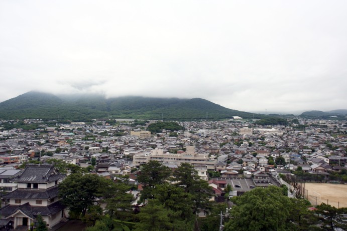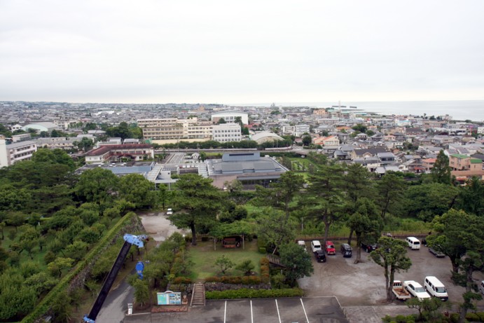 右は島原城天守閣から見る雲仙、右は島原湾の眺めることができます。