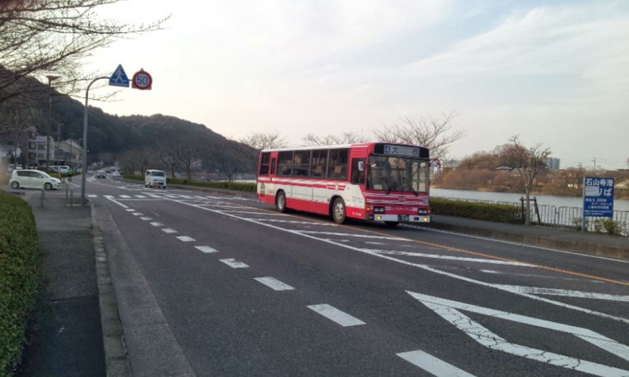 一昔前は県道大津上野線でした。今のようにまっすぐな道ではなく、瀬田川の流れに沿ったクネクネと曲がった道でした。現在は瀬田川縁も護岸工事されており、美しく歩きやすくなっていますが、石山寺東大門から京阪石山寺駅の間の“自転車通行可能”な歩道に旧道の名残を見ることができます。道端には“石山温泉”の宿があり、施設によっては食事もできますので、約900mの道のりを歩いてみてはいかがでしょうか?