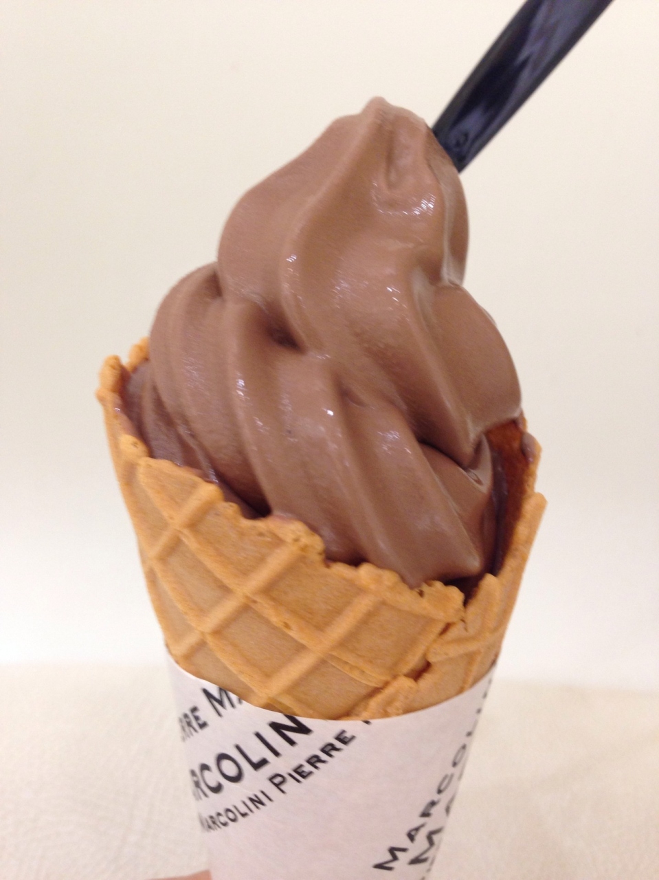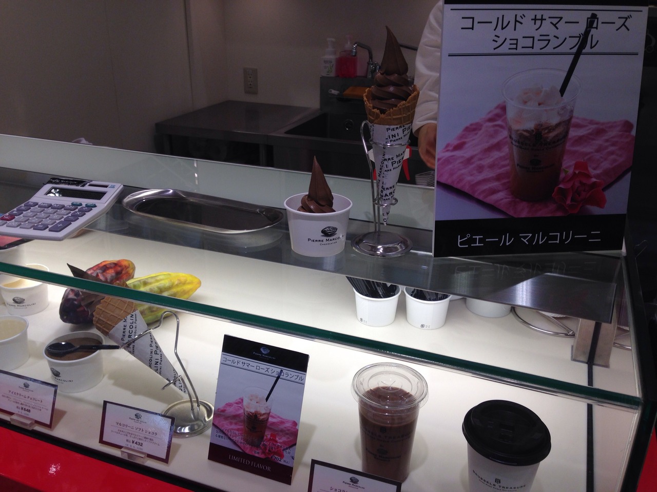 高級ショコラティエだけに重厚な扉を押して入店するのはどうも…という声があったかどうかな謎ですがデパ地下に常設出店し、商品を気軽にチラ見できるだけでなく432円でチョコソフトの販売もスタート。チョコの風味が心地よいちょっと濃厚系ソフトは美味でした。ネックはイートインスペースの少なさ。ショップに専用スペースがなくエレベーターホール脇とエスカレーター脇に設置してある椅子に腰掛けるしかありません。