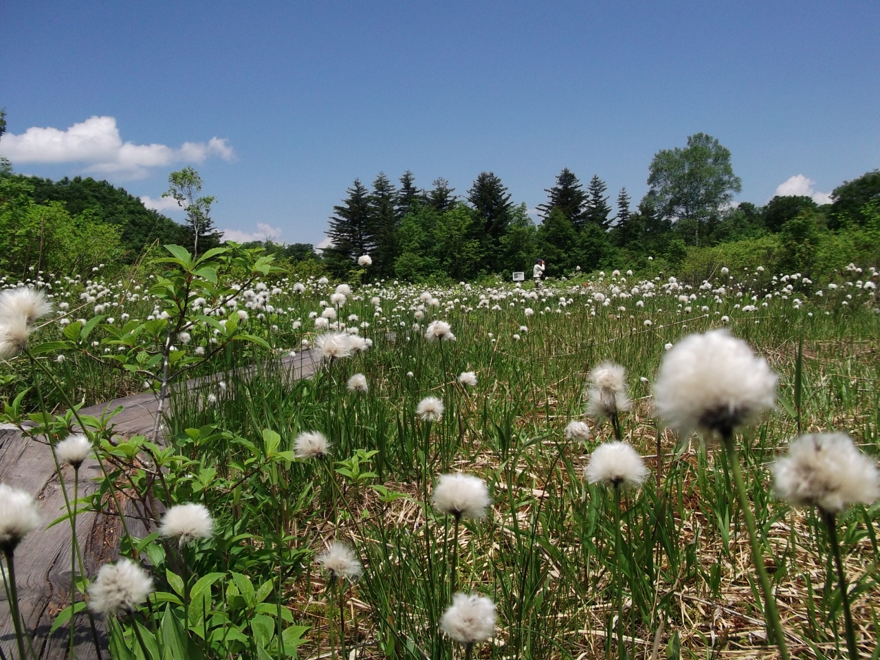 わたすげが満開と聞いて、6月半ばに行ってきました。青い空、緑の湿原、風に揺れている白いわたすげがとても良かったです。来月は黄色いニッコウキスゲが咲き乱れるようで、それもいいなぁと思いました。季節の花を楽しみながらの散策、鳥の鳴き声を聞きながら、リフレッシュするのにお勧めです。