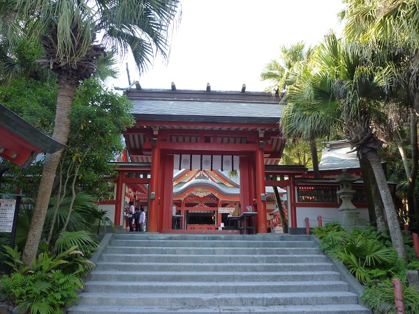 南国らしい亜熱帯植物、赤い神社は青い空に美しく、厳かに祀られてました。