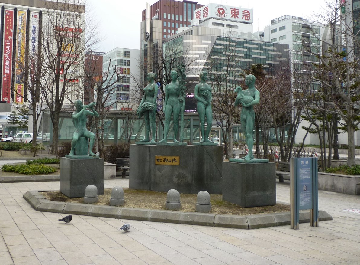 札幌駅に到着し、南口広場に出て周囲の景色をぐるっと見渡すとすぐ目に飛び込んでくる銅像です。たたずむ人や、子羊を抱いた人、角笛を吹く人など5体の銅像で構成されています。彫刻の詳しいことはわかりませんがのびのびとした人々の印象を受けました。
