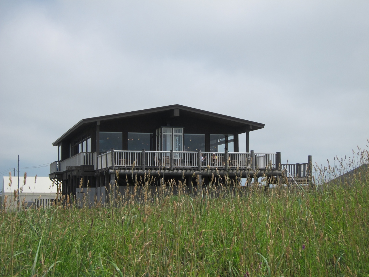 石狩川の河口、大きなログハウス風の建物から海岸線を眺めながらの食事。食堂は3階にあり、海や周囲の景色が眺められるよう、3方が大きな窓で囲われています。