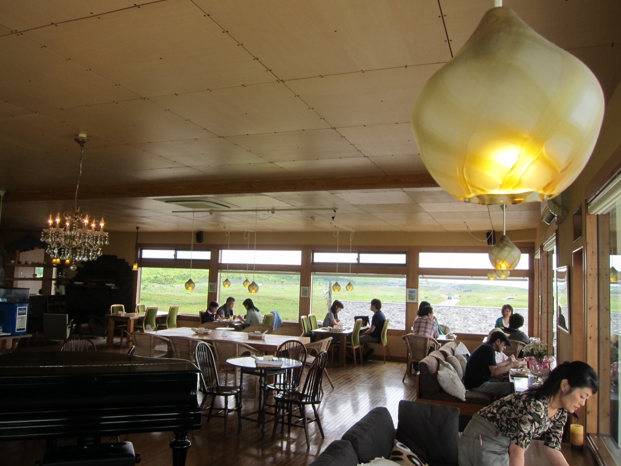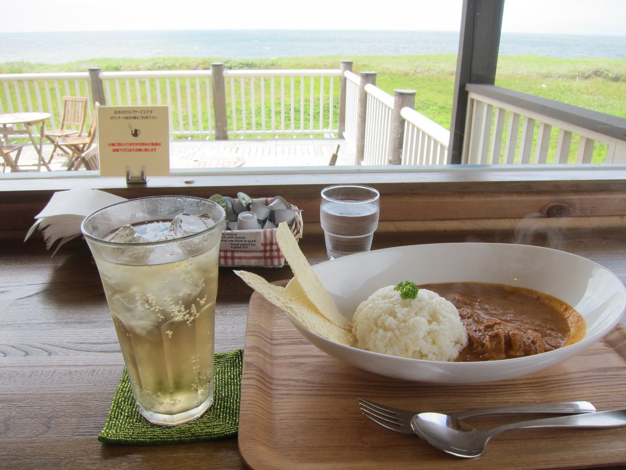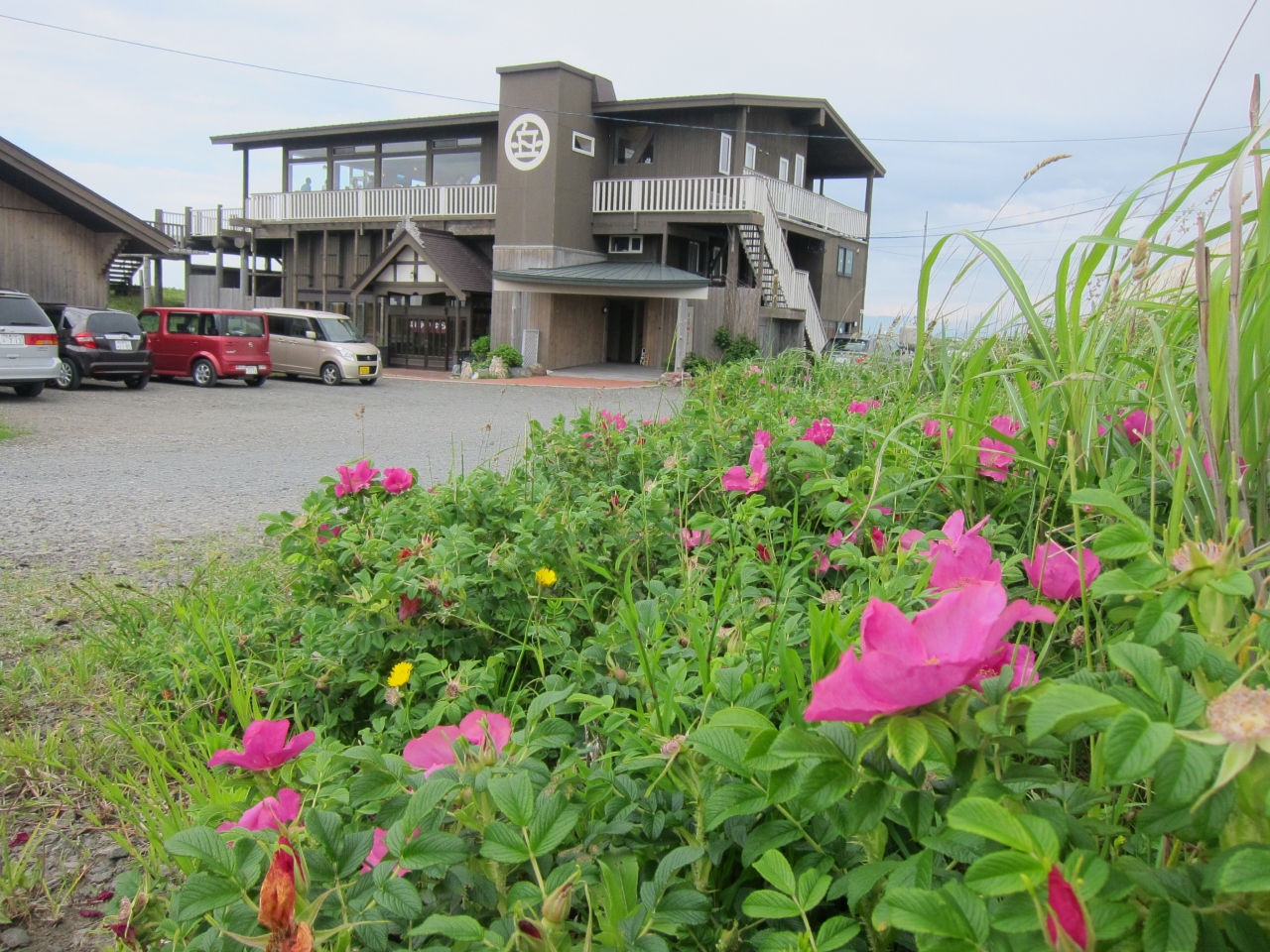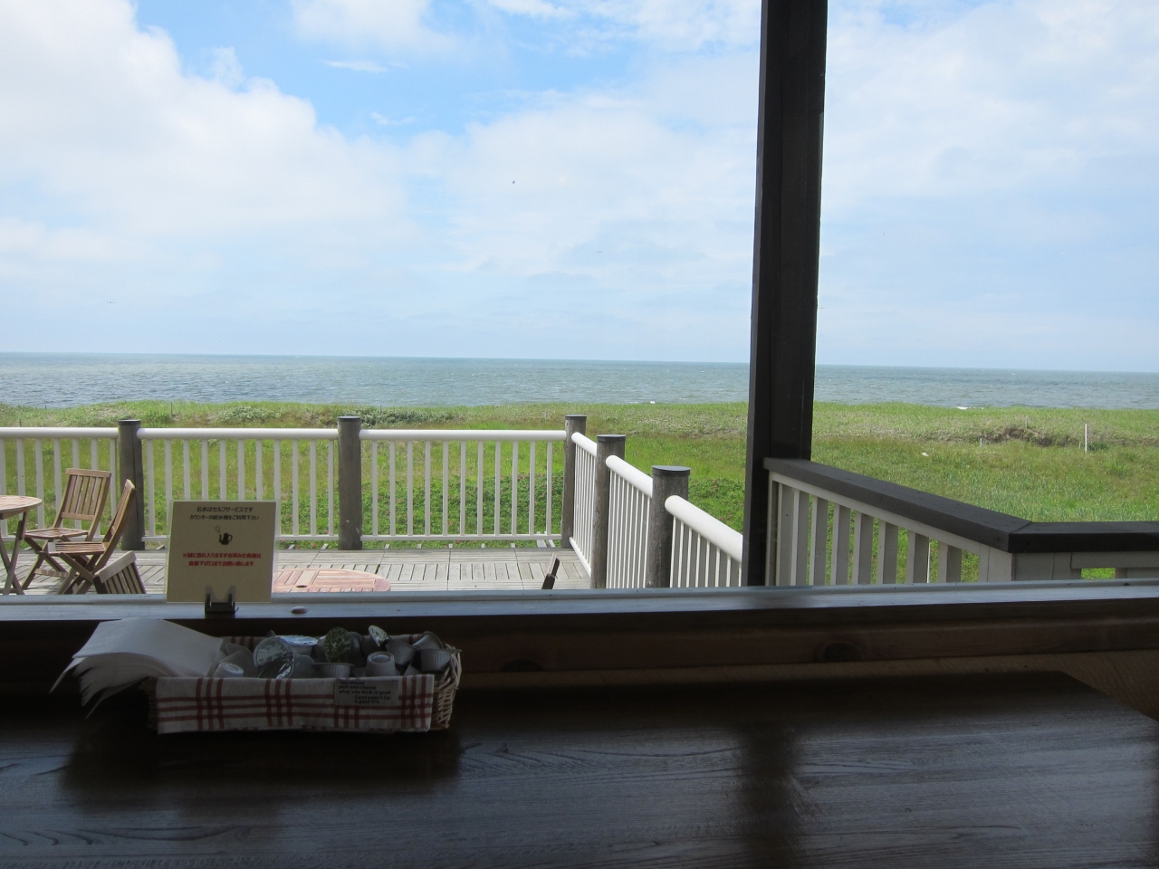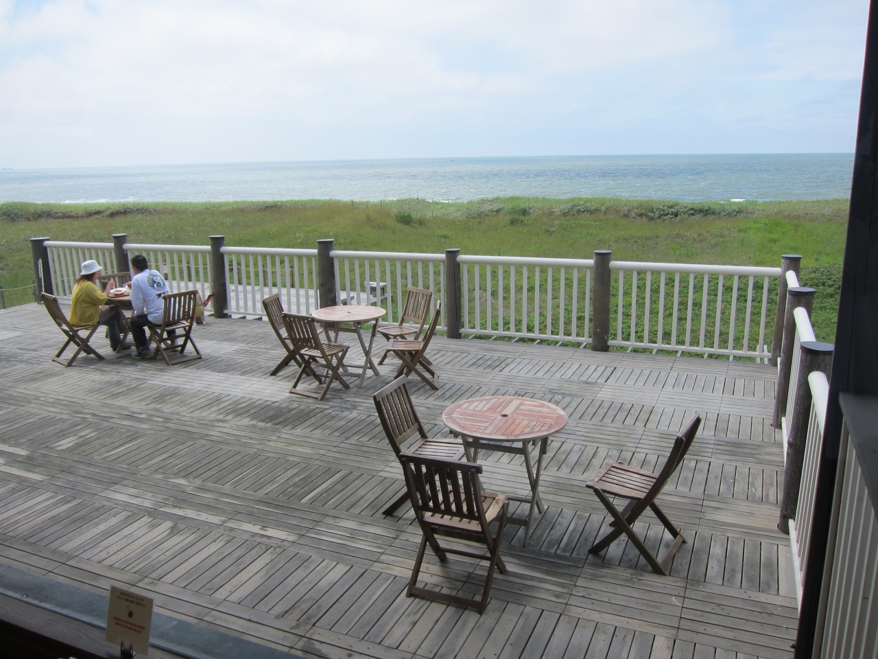 見通しの利くラウンジからソファーに座り、海岸線、ハマナス咲く原野を望む食事