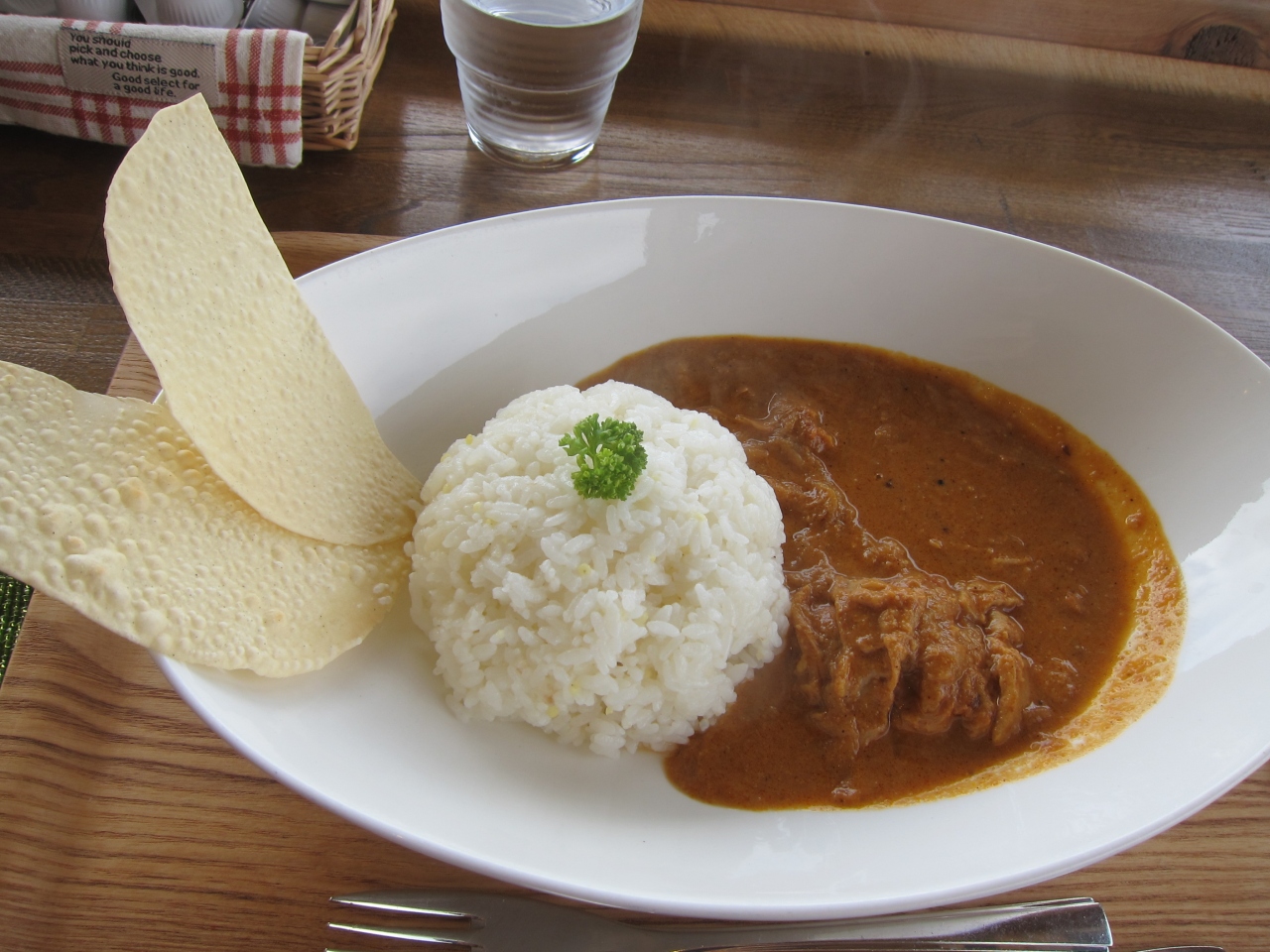 海を目の前に望む窓際の席に着席しました。窓際には通常の対面型のテーブル席もありますが、窓に正対したソファーの席もあります。景色と会話を楽しみながら座っていると、やがて食事が運ばれてきました。注文は予め、入室の際、カウンターで行います。パスタ、カレーがあります。アンチョビパスタも美味しそうですが、スモークサーモンのサラダパスタも石狩らしいメニューです。