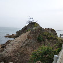 島根半島の南側を海岸沿いに走る、「しおかぜライン」。ドライブしていると、美保関に入ってすぐのところに、注連縄がかかった岩があります。これが男女岩です。その形から子宝に恵まれるとの俗信が生まれ、信仰を集めているようです。