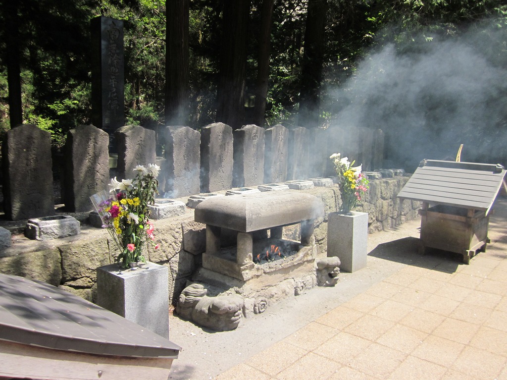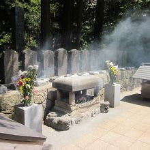 広場では線香を売っており、墓前では線香の煙がもうもうと立ち上がっています。