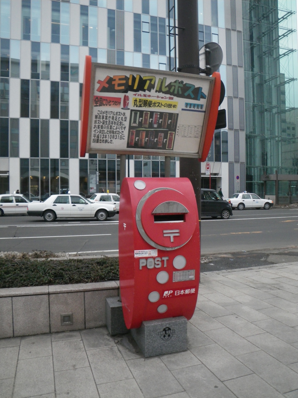 札幌駅南口広場にちょっと変わった郵便ポストがありました。郵政事業庁発足及び丸型郵便ポスト100年を記念して、2001年に設置した現役のポストです。イルミネーション型と表記してありました。夜になると光るのかな?