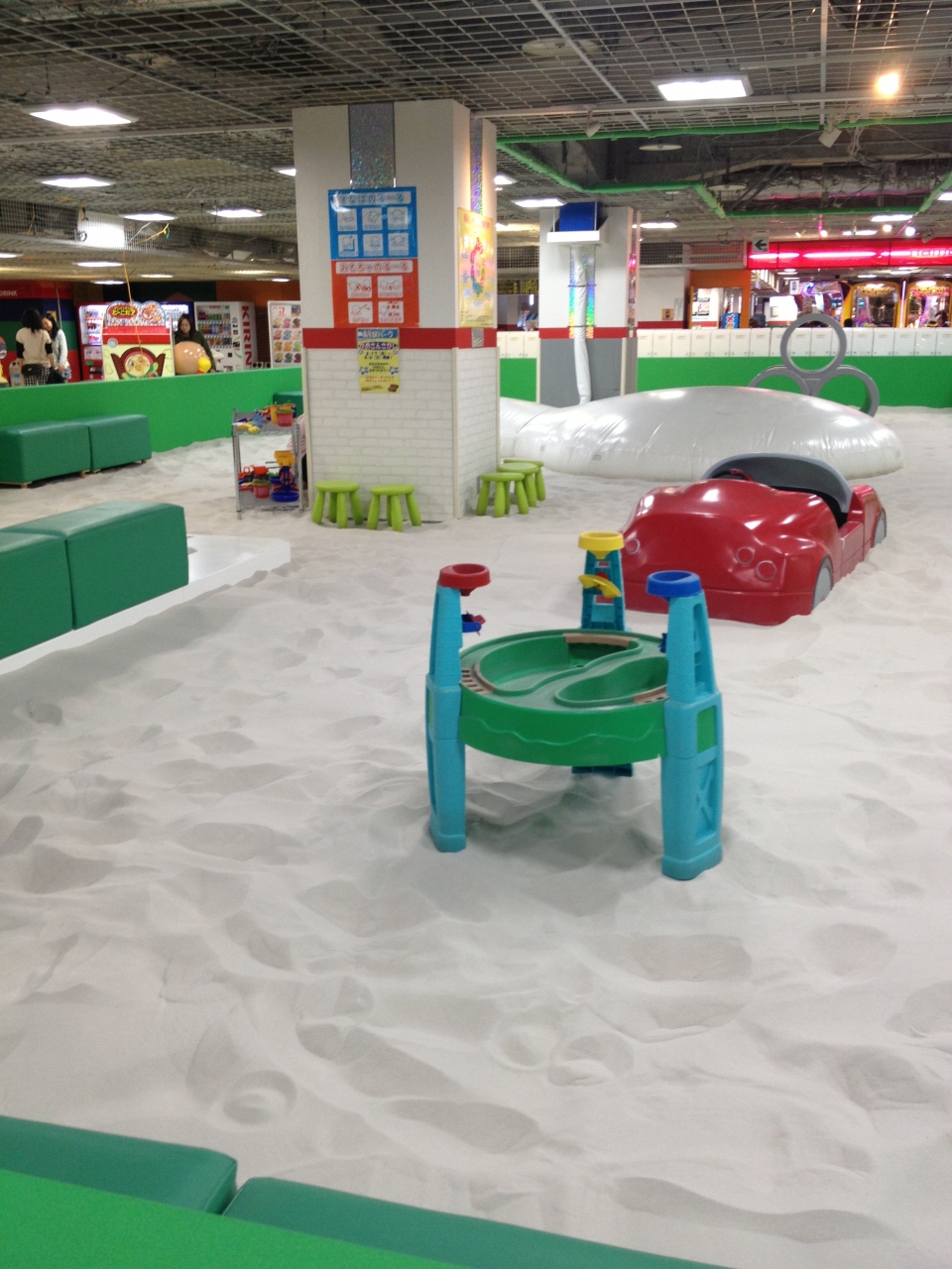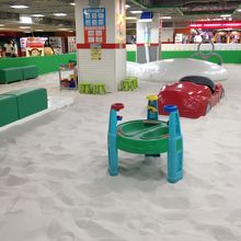 エスタ9階のナムコのゲーム機の中に砂場広場がありました。砂場の中にちょっとした遊具もあって、子供が裸足で遊べます。真っ白な砂はオーストラリア産の加熱精製砂「ホワイトサンド」を使用しているそうです。小さな子供向けの施設です。