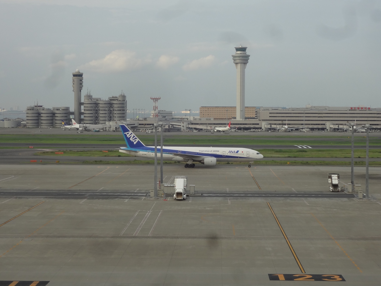 国内線利用時に時間があったので国際線ターミナルに足を延ばしてみました。展望デッキは江戸小町のひとつ上の5階にあります。エスカレーターで上がると左右に出入り口があり、デッキ内では繋がっています。展望デッキからは広大な滑走路とそれを挟んで国内線ターミナルを対面に見ることができます。飛行機は手前に駐機している外国の飛行機がちらほろ。発着枠の増加で少し増えたようですが、成田に比べるとまだ少ないですね。