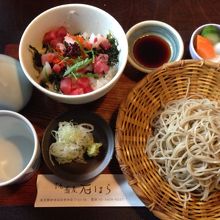 海鮮丼、炊き込みご飯、天丼の三種類と、暖かいお蕎麦か冷たいお蕎麦で選べます。