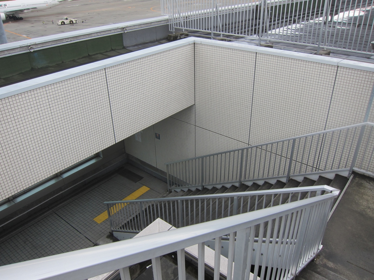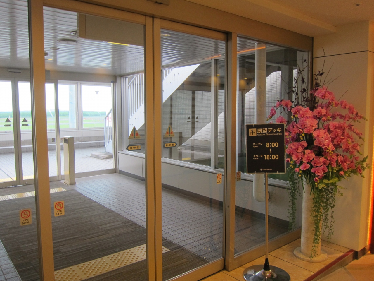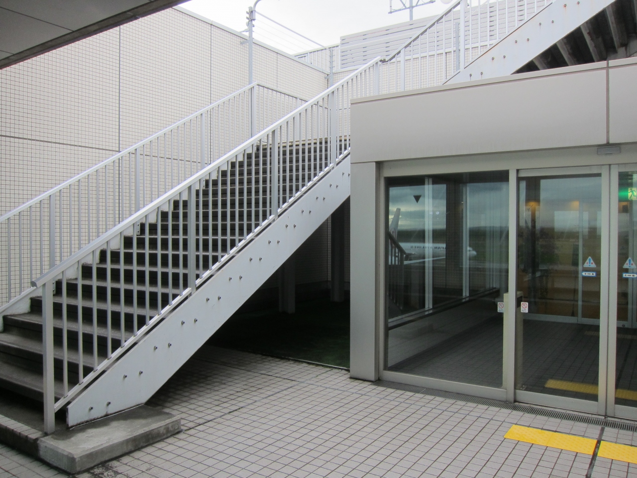 3階から自動ドアを出ると、わずかに雨よけのひさしのかかった所から、滑走路を眺めることができます。デッキはそこから階段で4階に上がったところです。エレベーターなどはありません。なお、4階に上がっても、配管をまたぐ階段が続いて、バリアフリーには欠けると思います。一段高いところからは見られますが、少し不便です。