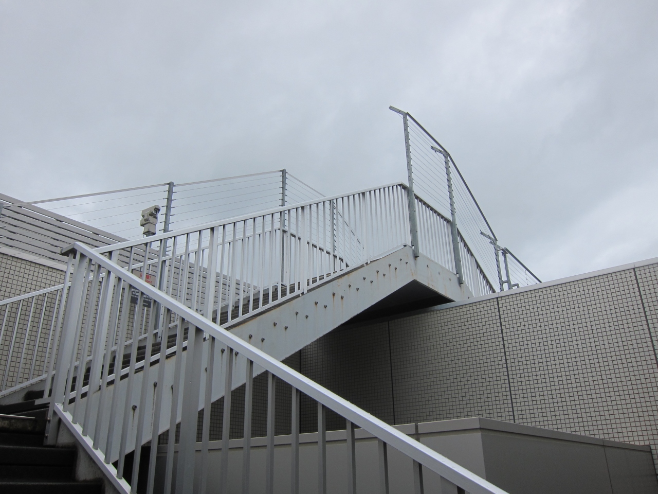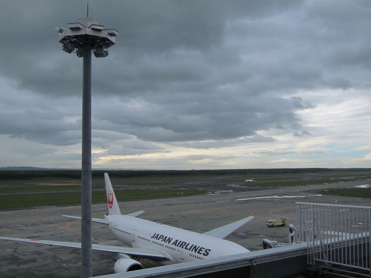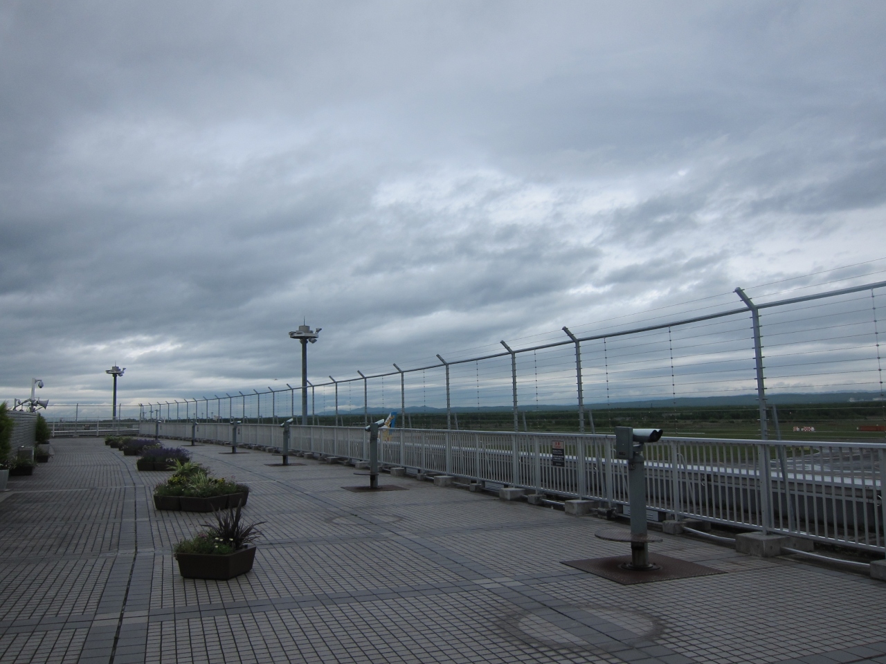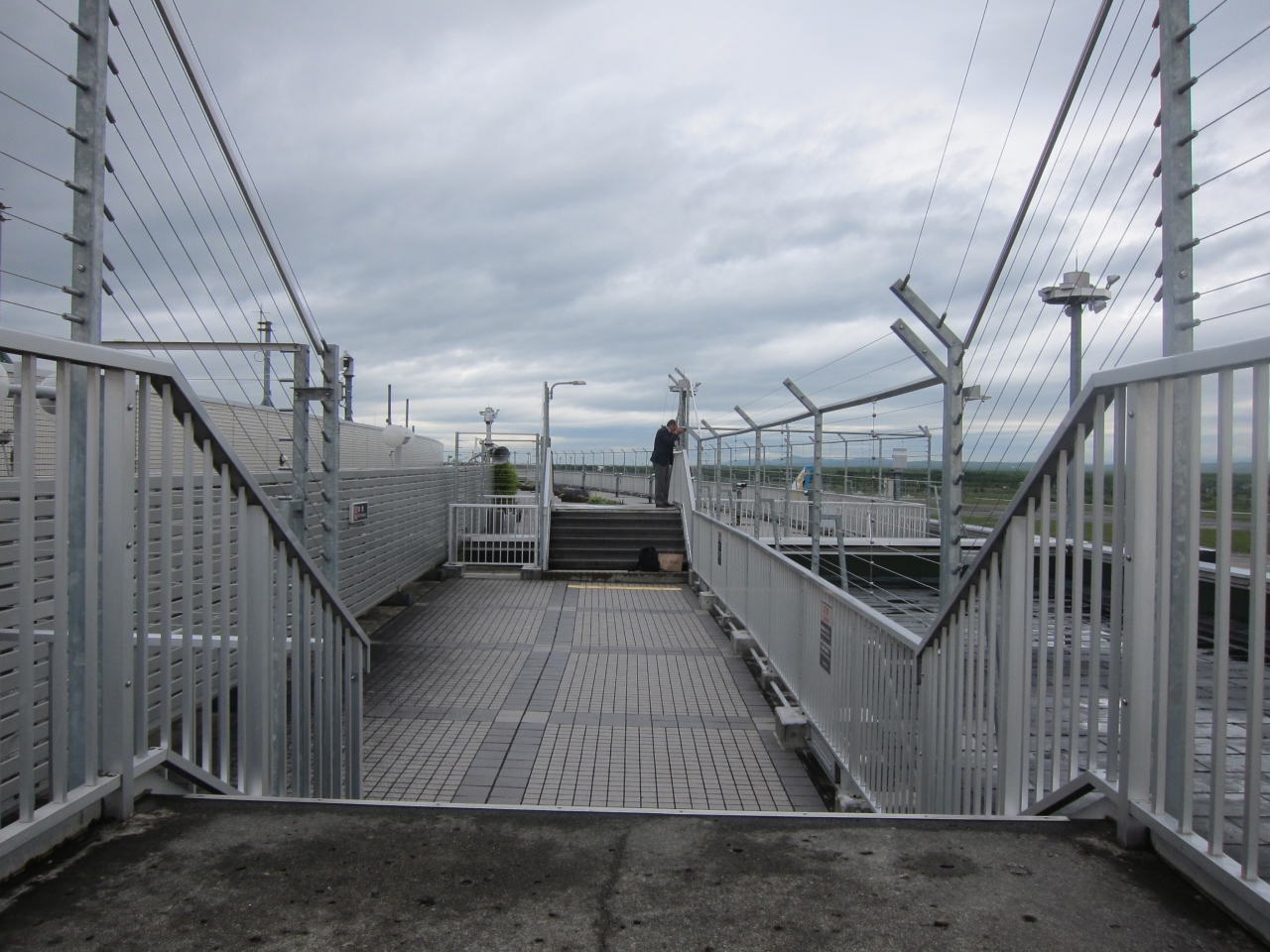 3階から自動ドアを出ると、わずかに雨よけのひさしのかかった所から、滑走路を眺めることができます。デッキはそこから階段で4階に上がったところです。エレベーターなどはありません。なお、4階に上がっても、配管をまたぐ階段が続いて、バリアフリーには欠けると思います。一段高いところからは見られますが、少し不便です。