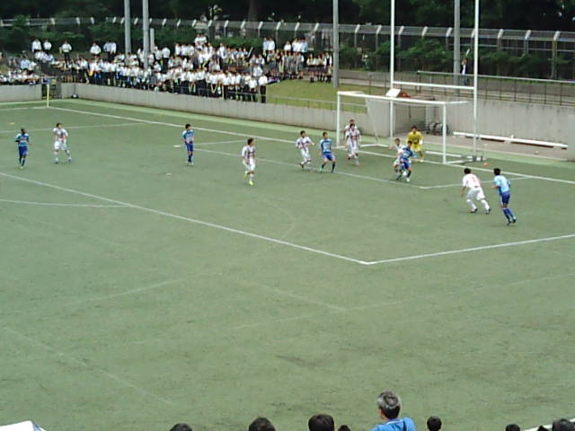 一休みしていると、第二球戯場の方から応援する歓声が聞こえてきました。見に行くと、高校サッカーのインターハイ出場をかけた試合が行われていました。入場料は無料のようで、入り口は解放されていました。入ってみると、同じ高校の生徒さんや保護者の方が応援しているようで、スタンドはぎっしり埋まっていました。まったく知り合いなどいない高校でしたが、激しく攻守が変わったり、ピッチとの近さがあったりして、テレビでワールドカップを見るよりも迫力があり、そのまま試合終了まで観戦してしまいました。高校サッカーでも、東京都のトップレベルともなると見ごたえがありました。