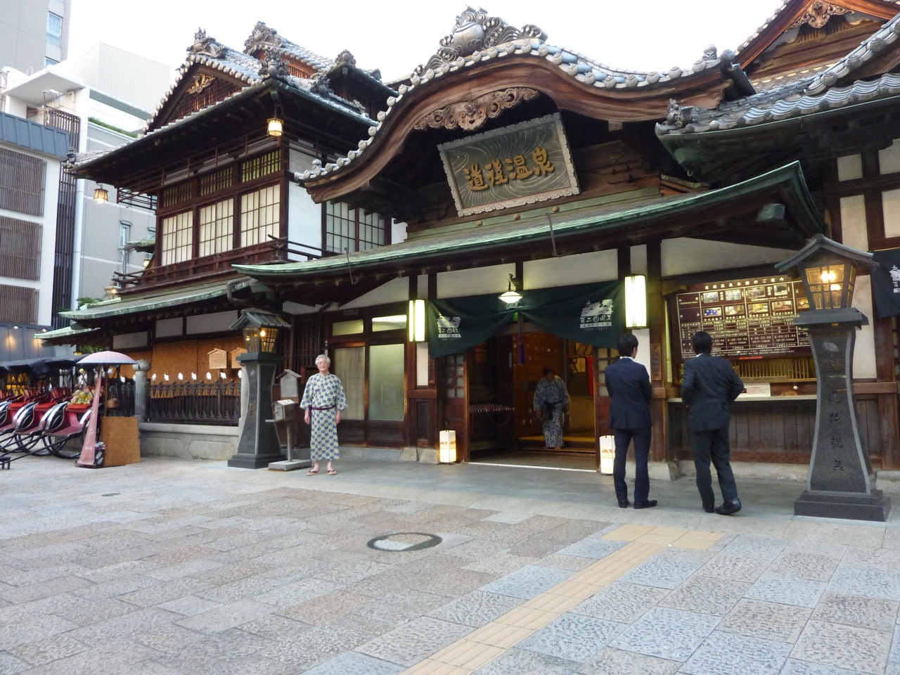 温泉入浴と言うと立湯は別にしてもそんなに深いイメージはないが、以前訪れた時、深い印象を持っていたが確認もしてみたかった。やはり深かった、説によると大変利用者が多く大勢は入れるようにとか・・・?外国人も多く有名なのが分かる。自分たちも含め近隣に宿泊する人達もそれぞれに温泉があるはずなのにそれぞれの浴衣を着て集まるのも風物詩なのだろうか?愛媛の国体前に建替えられる?ということのようだが逆にいい時に入浴できたと思う。建て替えも重要文化財であるので大きく変わるはずはないと信じてます。