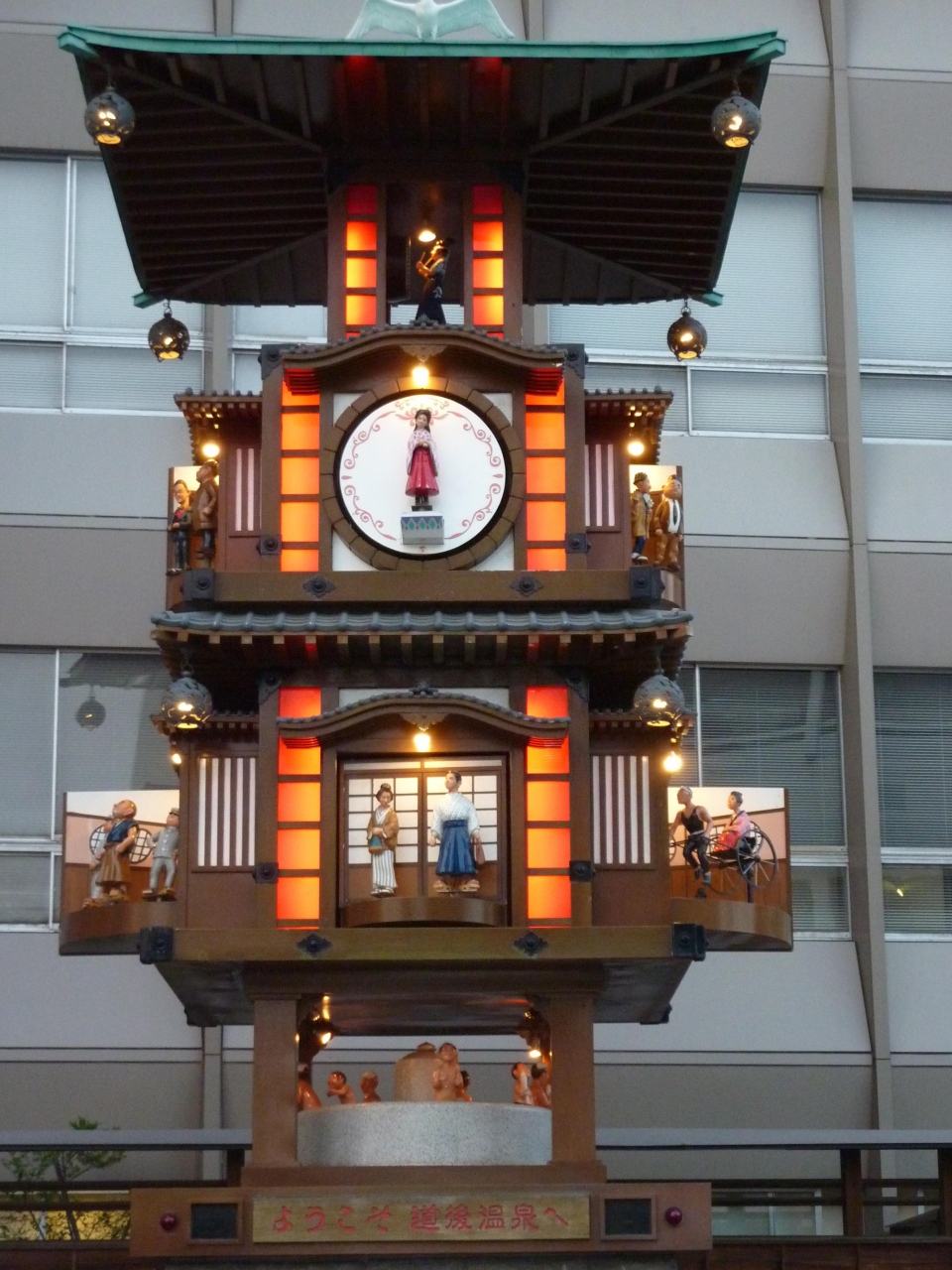 以前見た時も大きいと思っていたが、今回更に大きくなったと感じた?上昇して4段、横にも広がり動き出す(はりまや橋のからくり時計も同様であった)、八戸の三社大祭の山車や久慈の夏祭りの山車他横の広がりのイメージと同じ、待ち時間駅前に止まっている坊ちゃん電車等鑑賞でき風呂上がりには丁度良いかな?