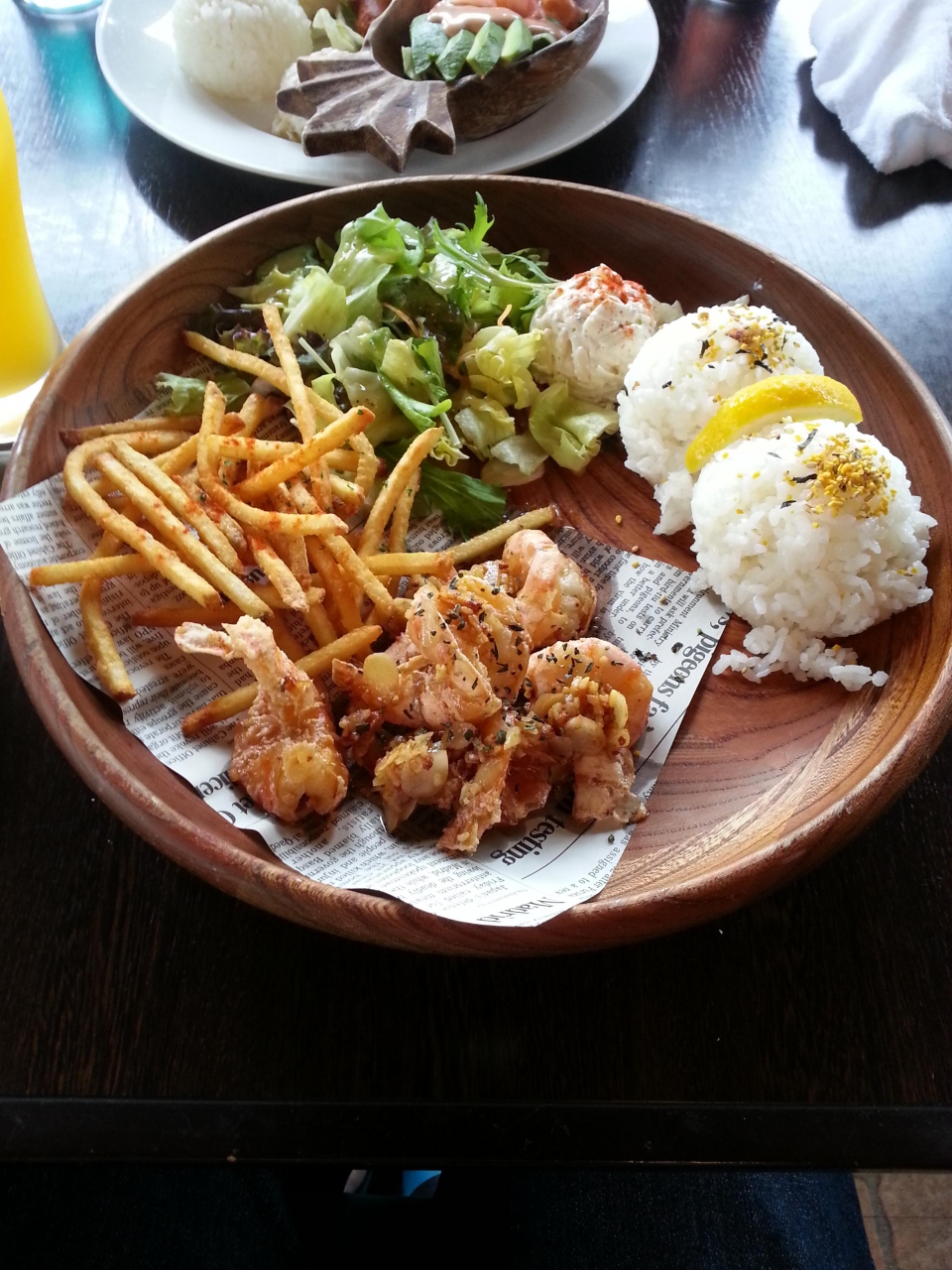 沼津港にあるお店は港らしく魚料理のお店だらけの中唯一このお店はハワイアン料理のお店で解放感のあるつくりとなっている お昼の時間帯だった為、ランチメニューがあり食べたかったガーリックシュリンププレートを頼み、到着したとたんバターとガーリックの香りが漂いおいしく頂きました。