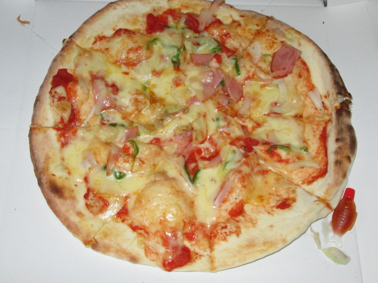 埼玉県のピザのお店、数年前に秘密のケンミンショーで紹介されたようです。店内にケンミンのるーぱん、るーぱんミックスピザ・ドリームサイズが、土日限定1,100円が半額」が貼ってありました。これはと思い、お持ち帰りで食べてみました。タバスコのような調味料が、さかなの形の容器に入って付いてきました。