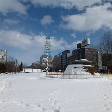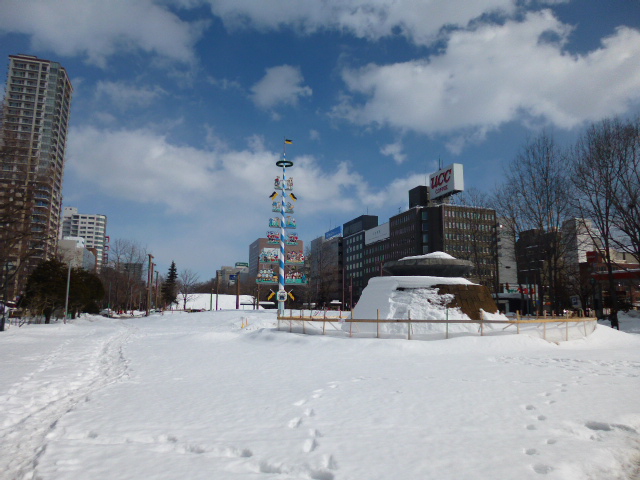 姉妹都市ミュンヘンから送られました。雪祭りも終わり、大きな雪山だけがあちこちに残されているだけの、大通り公園でしたが、このオブジェは見ごたえがありました。マイバウムは本来ドイツの祭木で、シラカバなどの樹木に飾りつけをするクリスマスツリーのようなものだそうです。札幌の姉妹都市であるミュンヘンから1976年に寄贈されて設置されたそうで、同じものは、ミュンヘン市のヴィクトリュアリエン市場に立ってるそうです。