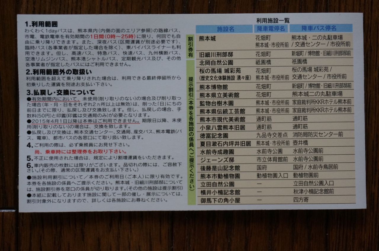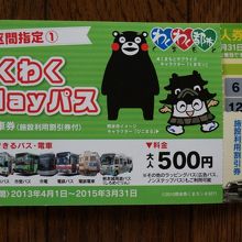 熊本駅から熊本城や水前寺公園,商店街に行くには路面電車を使うのが気軽ですが,市内のバス,電車を1日500円で利用できる「わくわく1dayパス」がお勧めです。路面電車は1回150円なので3回では元が取れませんが,施設利用料の割引もあるので,トータルでは損になりません。