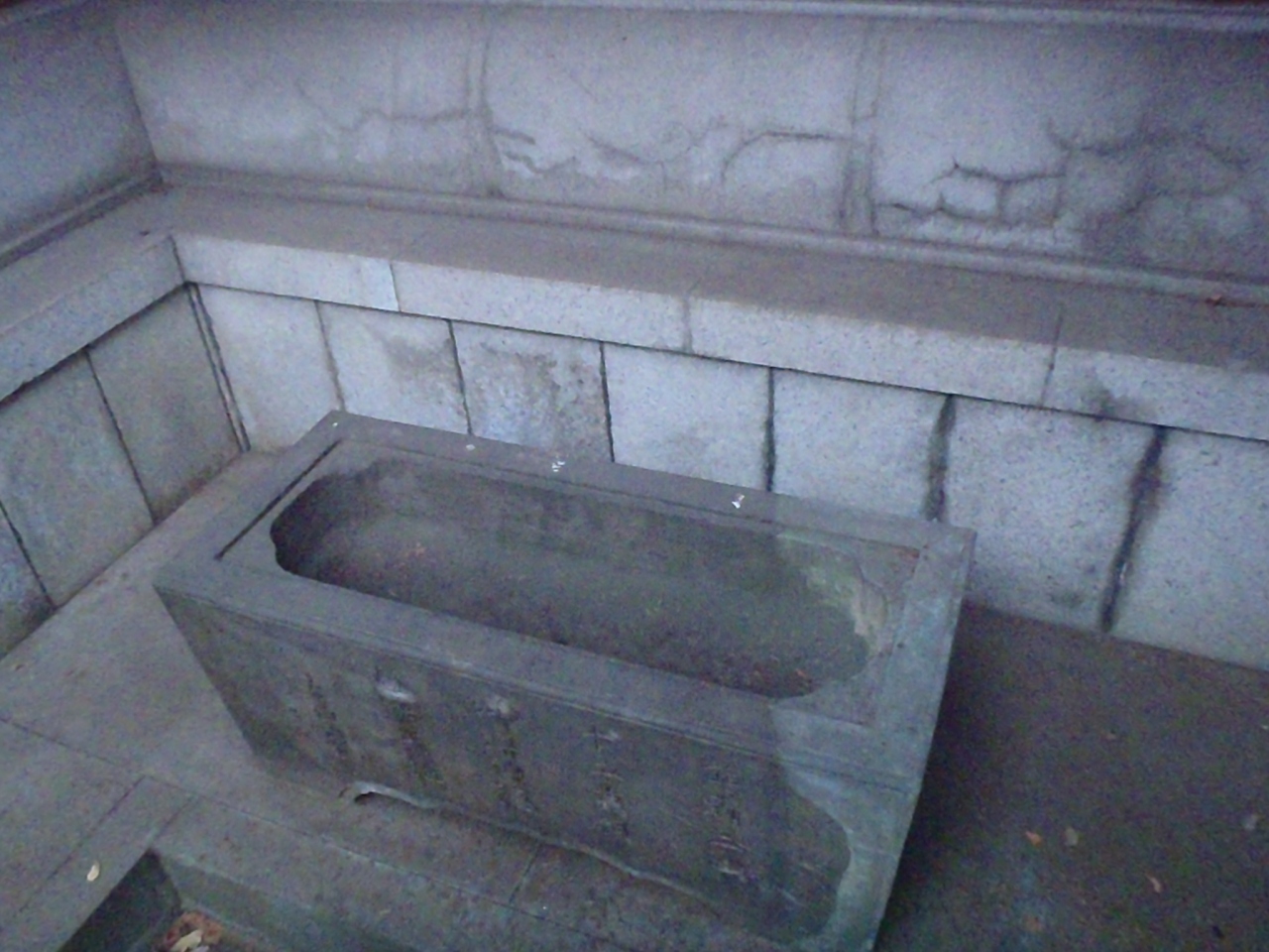 本殿に向かって右側、東側にある大田南畝の水鉢は公園側から神社に入るとわかりやすいです。
