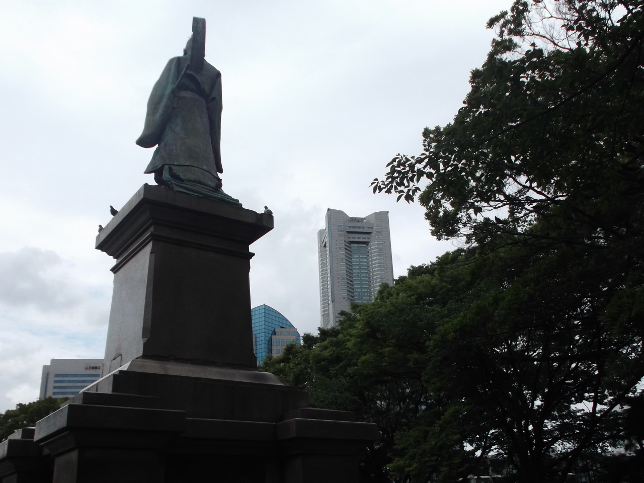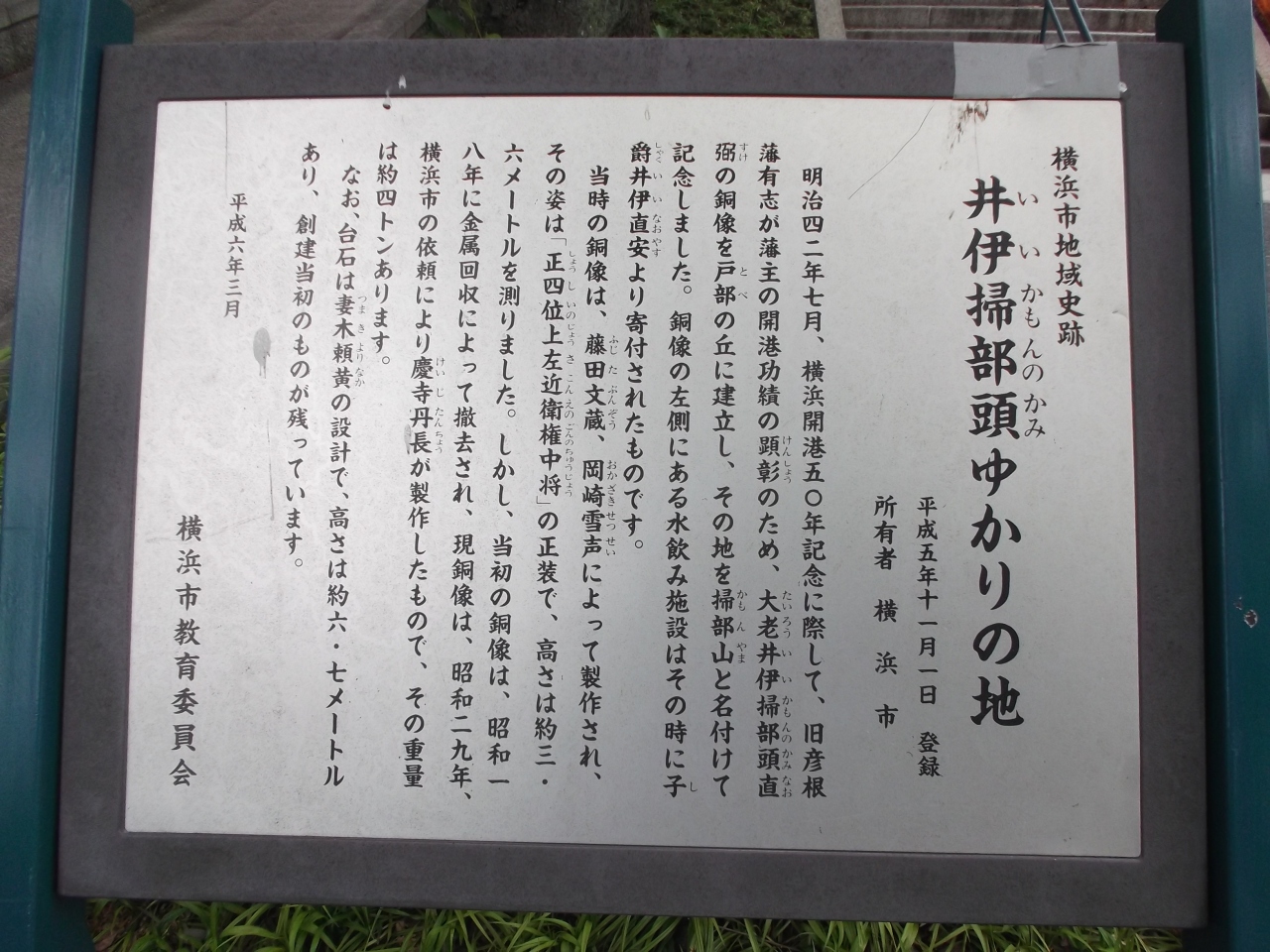 それが横浜開港に尽くした井伊直弼像。歴史上見方により異論ありとする伝えありますが、ここでは開港の功績を称え立派な銅像が建立されています。現在のものは2代目で昭和29年(1954)再建されています。由緒は広場のプレートに記されています。