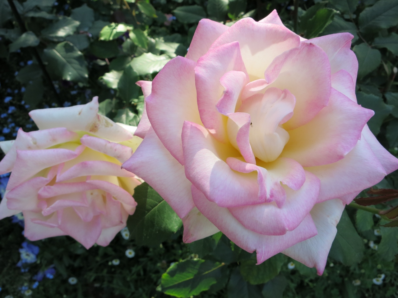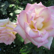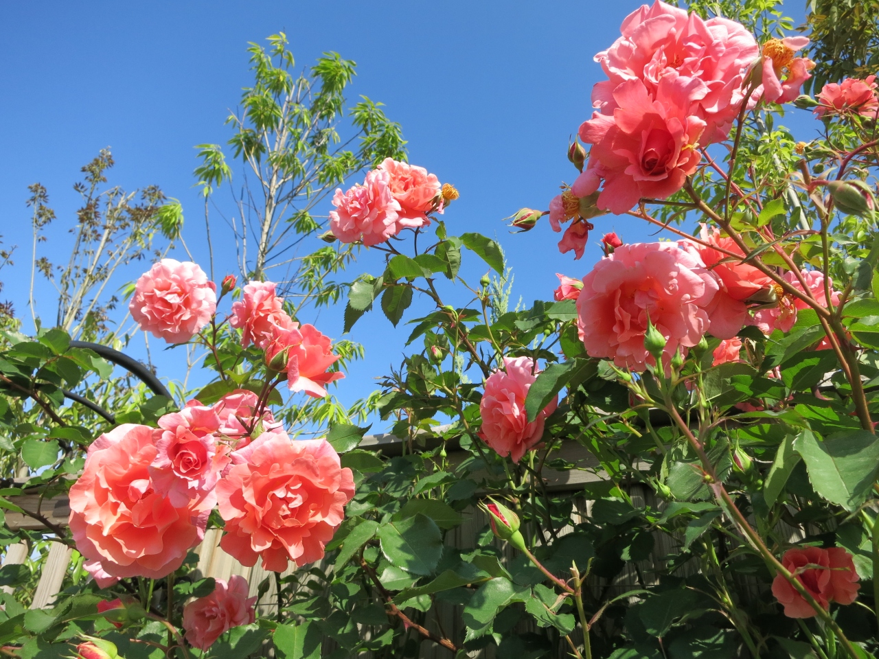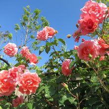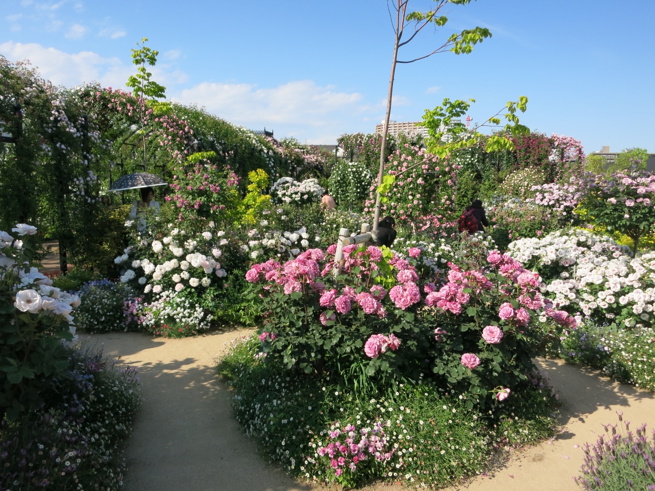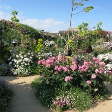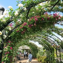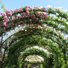 入場券を買って入るとアーケードの通路があり、弦バラで覆われています。アーケードの周辺はバラの色が、ピンク系、白系、黄色系に色分けされており、広い青空の中とても見事でした。
