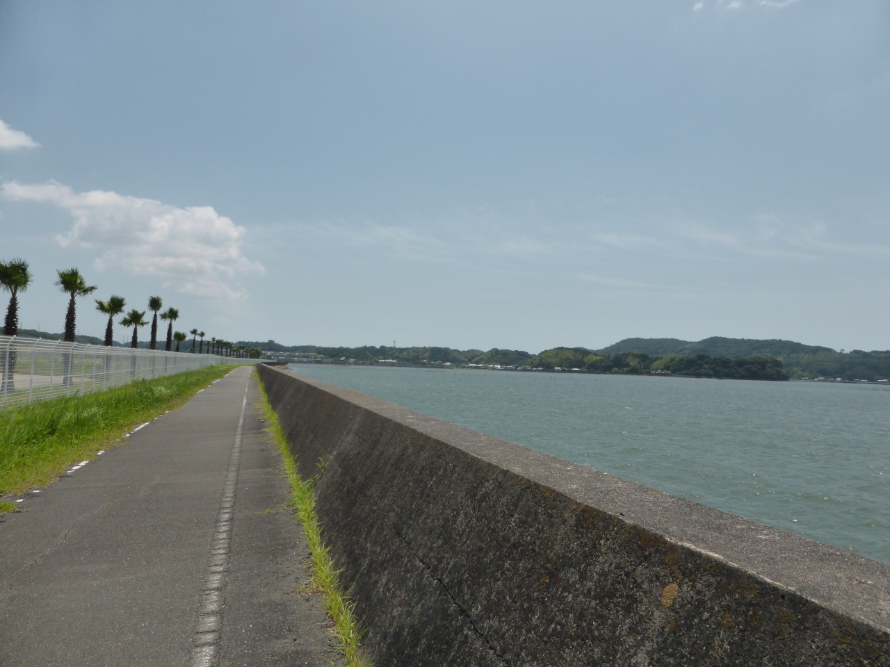 浜名湖は海水の湖です。あさりや、うなぎ、かきなどが獲れます。湖岸は入り組んでいて、一周すると車でも何時間もかかります。道は、湖岸沿いに走っていますが、近づいたり、少し離れたりします。自転車で一周する人も多いです。
